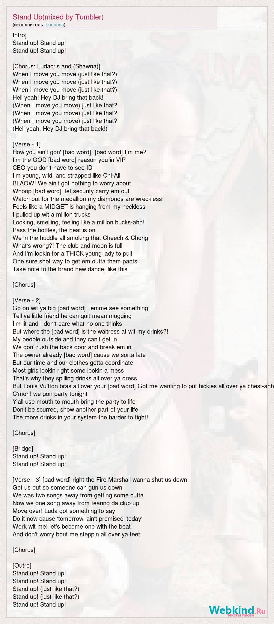 Intro] Stand up! Stand up! Stand up! Stand up! [Chorus: Ludacris and (Shawna)] When I move you move (just like that?) When I move you move (just like that?) When I move you move (just like that?) Hell yeah! Hey DJ bring that back! (When I move you move) just like that? (When I move you move) just like that? (When I move you move) just like that? (Hell yeah, Hey DJ bring that back!) [Verse - 1] How you ain't gon' [bad word] [bad word] I'm me? I'm the GOD [bad word] reason you in VIP CEO you don't have to see ID I'm young, wild, and strapped like Chi-Ali BLAOW! We ain't got nothing to worry about Whoop [bad word] let security carry em out Watch out for the medallion my diamonds are wreckless Feels like a MIDGET is hanging from my neckless I pulled up wit a million trucks Looking, smelling, feeling like a million bucks-ahh! Pass the bottles, the heat is on We in the huddle all smoking that Cheech & Chong What's wrong?! The club and moon is full And I'm lookin for a THICK young lady to pull One sure shot way to get em outta them pants Take note to the brand new dance, like this [Chorus] [Verse - 2] Go on wit ya big [bad word] lemme see something Tell ya little friend he can quit mean mugging I'm lit and I don't care what no one thinks But where the [bad word] is the waitress at wit my drinks?! My people outside and they can't get in We gon' rush the back door and break em in The owner already [bad word] cause we sorta late But our time and our clothes gotta coordinate Most girls lookin right some lookin a mess That's why they spilling drinks all over ya dress But Louis Vuitton bras all over your [bad word] Got me wanting to put hickies all over ya chest-ahh C'mon! we gon party tonight Y'all use mouth to mouth bring the party to life Don't be scurred, show another part of your life The more drinks in your system the harder to fight! [Chorus] [Bridge] Stand up! Stand up! Stand up! Stand up! [Verse - 3] [bad word] right the Fire Marshall wanna shut us down Get us out so someone can gun us down We was two songs away from getting some cutta Now we one song away from tearing da club up Move over! Luda got something to say Do it now cause 'tomorrow' ain't promised 'today' Work wit me! let's become one with the beat And don't worry bout me steppin all over ya feet [Chorus] [Outro] Stand up! Stand up! Stand up! Stand up! Stand up! (just like that?) Stand up! (just like that?) Stand up! Stand up!