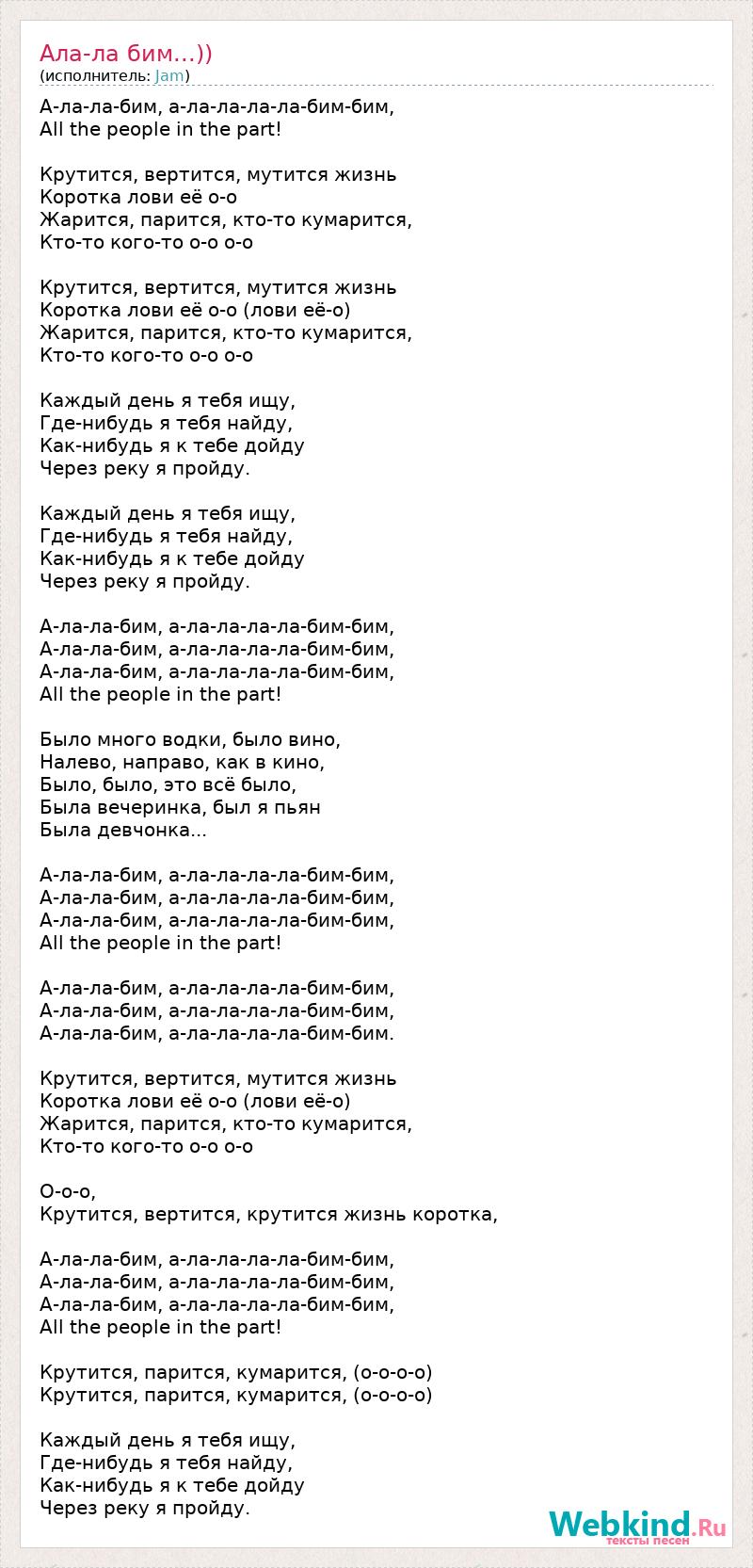 А-ла-ла-бим, а-ла-ла-ла-ла-бим-бим, All the people in the part! Крутится, вертится, мутится жизнь Коротка лови её о-о Жарится, парится, кто-то кумарится, Кто-то кого-то о-о о-о Крутится, вертится, мутится жизнь Коротка лови её о-о (лови её-о) Жарится, парится, кто-то кумарится, Кто-то кого-то о-о о-о Каждый день я тебя ищу, Где-нибудь я тебя найду, Как-нибудь я к тебе дойду Через реку я пройду. Каждый день я тебя ищу, Где-нибудь я тебя найду, Как-нибудь я к тебе дойду Через реку я пройду. А-ла-ла-бим, а-ла-ла-ла-ла-бим-бим, А-ла-ла-бим, а-ла-ла-ла-ла-бим-бим, А-ла-ла-бим, а-ла-ла-ла-ла-бим-бим, All the people in the part! Было много водки, было вино, Налево, направо, как в кино, Было, было, это всё было, Была вечеринка, был я пьян Была девчонка... А-ла-ла-бим, а-ла-ла-ла-ла-бим-бим, А-ла-ла-бим, а-ла-ла-ла-ла-бим-бим, А-ла-ла-бим, а-ла-ла-ла-ла-бим-бим, All the people in the part! А-ла-ла-бим, а-ла-ла-ла-ла-бим-бим, А-ла-ла-бим, а-ла-ла-ла-ла-бим-бим, А-ла-ла-бим, а-ла-ла-ла-ла-бим-бим. Крутится, вертится, мутится жизнь Коротка лови её о-о (лови её-о) Жарится, парится, кто-то кумарится, Кто-то кого-то о-о о-о О-о-о, Крутится, вертится, крутится жизнь коротка, А-ла-ла-бим, а-ла-ла-ла-ла-бим-бим, А-ла-ла-бим, а-ла-ла-ла-ла-бим-бим, А-ла-ла-бим, а-ла-ла-ла-ла-бим-бим, All the people in the part! Крутится, парится, кумарится, (о-о-о-о) Крутится, парится, кумарится, (о-о-о-о) Каждый день я тебя ищу, Где-нибудь я тебя найду, Как-нибудь я к тебе дойду Через реку я пройду.