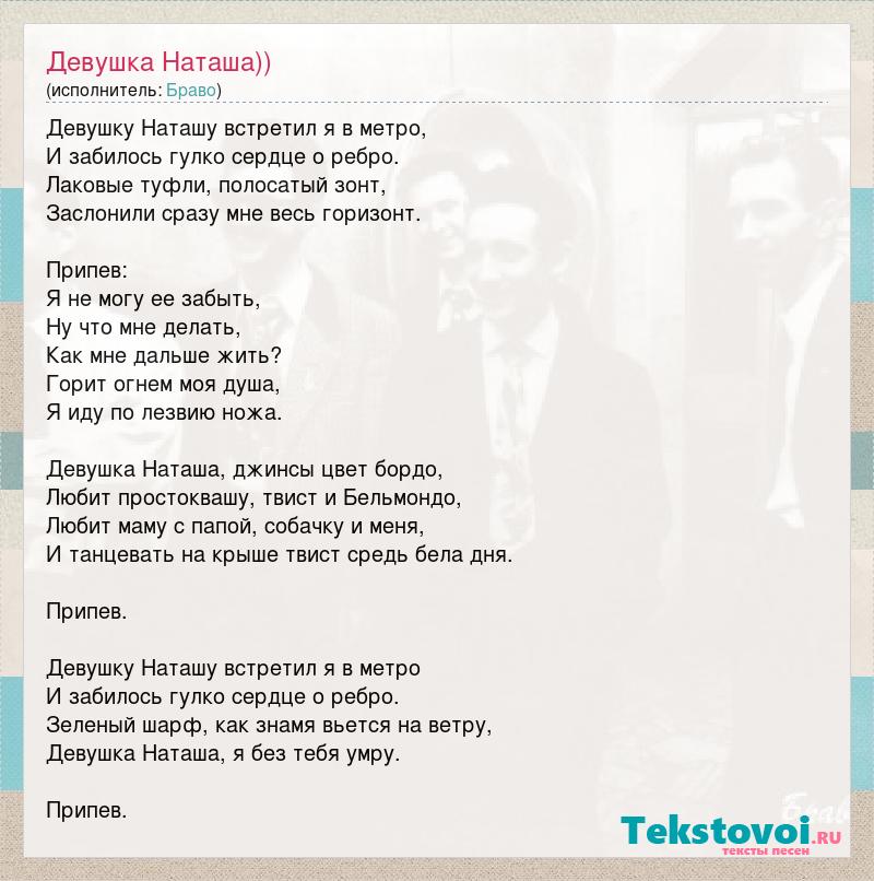 Девушку Наташу встретил я в метро, И забилось гулко сердце о ребро. Лаковые туфли, полосатый зонт, Заслонили сразу мне весь горизонт. Припев: Я не могу ее забыть, Ну что мне делать, Как мне дальше жить? Горит огнем моя душа, Я иду по лезвию ножа. Девушка Наташа, джинсы цвет бордо, Любит простоквашу, твист и Бельмондо, Любит маму с папой, собачку и меня, И танцевать на крыше твист средь бела дня. Припев. Девушку Наташу встретил я в метро И забилось гулко сердце о ребро. Зеленый шарф, как знамя вьется на ветру, Девушка Наташа, я без тебя умру. Припев.