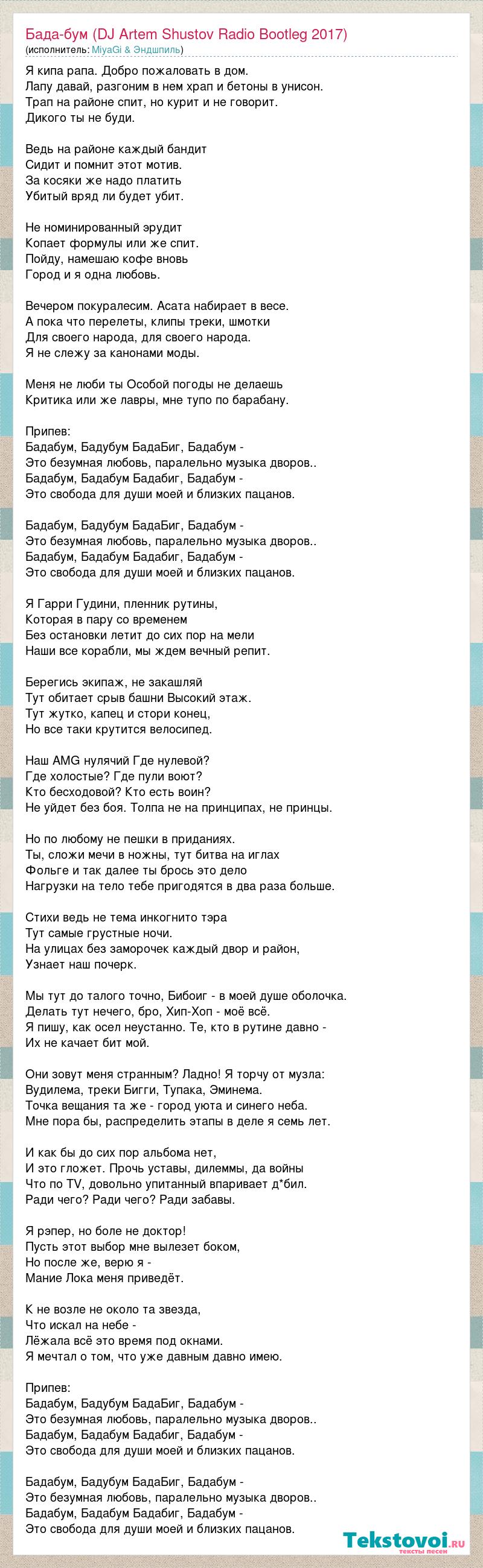 Я кипа рапа. Добро пожаловать в дом. Лапу давай, разгоним в нем храп и бетоны в унисон. Трап на районе спит, но курит и не говорит. Дикого ты не буди. Ведь на районе каждый бандит Сидит и помнит этот мотив. За косяки же надо платить Убитый вряд ли будет убит. Не номинированный эрудит Копает формулы или же спит. Пойду, намешаю кофе вновь Город и я одна любовь. Вечером покуралесим. Асата набирает в весе. А пока что перелеты, клипы треки, шмотки Для своего народа, для своего народа. Я не слежу за канонами моды. Меня не люби ты Особой погоды не делаешь Критика или же лавры, мне тупо по барабану. Припев: Бадабум, Бадубум БадаБиг, Бадабум - Это безумная любовь, паралельно музыка дворов.. Бадабум, Бадабум Бадабиг, Бадабум - Это свобода для души моей и близких пацанов. Бадабум, Бадубум БадаБиг, Бадабум - Это безумная любовь, паралельно музыка дворов.. Бадабум, Бадабум Бадабиг, Бадабум - Это свобода для души моей и близких пацанов. Я Гарри Гудини, пленник рутины, Которая в пару со временем Без остановки летит до сих пор на мели Наши все корабли, мы ждем вечный репит. Берегись экипаж, не закашляй Тут обитает срыв башни Высокий этаж. Тут жутко, капец и стори конец, Но все таки крутится велосипед. Наш AMG нулячий Где нулевой? Где холостые? Где пули воют? Кто бесходовой? Кто есть воин? Не уйдет без боя. Толпа не на принципах, не принцы. Но по любому не пешки в приданиях. Ты, сложи мечи в ножны, тут битва на иглах Фольге и так далее ты брось это дело Нагрузки на тело тебе пригодятся в два раза больше. Стихи ведь не тема инкогнито тэра Тут самые грустные ночи. На улицах без заморочек каждый двор и район, Узнает наш почерк. Мы тут до талого точно, Бибоиг - в моей душе оболочка. Делать тут нечего, бро, Хип-Хоп - моё всё. Я пишу, как осел неустанно. Те, кто в рутине давно - Их не качает бит мой. Они зовут меня странным? Ладно! Я торчу от музла: Вудилема, треки Бигги, Тупака, Эминема. Точка вещания та же - город уюта и синего неба. Мне пора бы, распределить этапы в деле я семь лет. И как бы до сих пор альбома нет, И это гложет. Прочь уставы, дилеммы, да войны Что по TV, довольно упитанный впаривает д*бил. Ради чего? Ради чего? Ради забавы. Я рэпер, но боле не доктор! Пусть этот выбор мне вылезет боком, Но после же, верю я - Мание Лока меня приведёт. К не возле не около та звезда, Что искал на небе - Лёжала всё это время под окнами. Я мечтал о том, что уже давным давно имею. Припев: Бадабум, Бадубум БадаБиг, Бадабум - Это безумная любовь, паралельно музыка дворов.. Бадабум, Бадабум Бадабиг, Бадабум - Это свобода для души моей и близких пацанов. Бадабум, Бадубум БадаБиг, Бадабум - Это безумная любовь, паралельно музыка дворов.. Бадабум, Бадабум Бадабиг, Бадабум - Это свобода для души моей и близких пацанов.