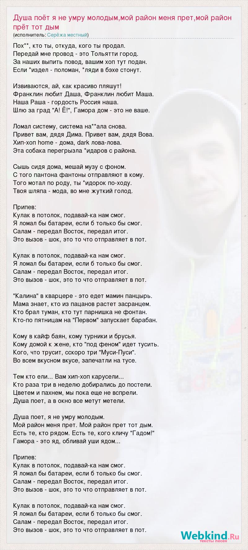 Душа поёт я не умру молодым,мой район меня прет,мой район прёт тот дым