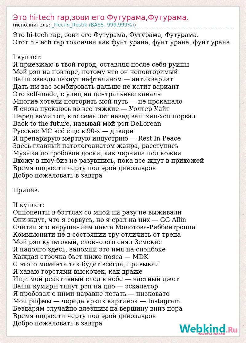 Это hi-tech rap, зови его Футурама, Футурама, Футурама. Этот hi-tech rap токсичен как фунт урана, фунт урана, фунт урана. I куплет: Я приезжаю в твой город, оставляя после себя руины Мой рэп на повторе, потому что он неповторимый Ваши звезды пахнут нафталином — антиквариат Дать им вас зомбировать дальше не катит вариант Это self-made, с улиц на центральные каналы Многие хотели повторить мой путь — не проканало Я снова пускаюсь во все тяжкие — Уолтер Уайт Перед вами тот, кто семь лет назад ваш хип-хоп порвал Back to the future, называй мой рэп DeLorean Русские MC всё еще в 90-х — дикари Я препарирую мертвую индустрию — Rest In Peace Здесь главный патологоанатом жанра, расступись Музыка до гробовой доски, как чернила под кожей Вхожу в шоу-биз не разувшись, пока все ждут в прихожей Время подвести черту под эрой динозавров Добро пожаловать в завтра Припев. II куплет: Оппоненты в бэттлах со мной ни разу не выживали Они ждут, что я сорвусь, но я срал на них — GG Allin Считай это нарушением пакта Молотова-Риббентроппа Коммьюнити не в состоянии тру отличить от трепа Мой рэп культовый, словно его снял Земекис Я надолго здесь, запомни это имя на снэпбэке Каждая строчка бьет ниже пояса — MDK С этого момента так будет всегда, привыкай Я хаваю горстями выскочек, как драже Ищи мой реактивный след в небе — частный джет Ваши кумиры тянут рэп на дно — эскалатор Я пробовал с ними наравне летать — низковато Мои рифмы — череда ярких картинок — Instagram Бездарям случайно влезшим на вершину вниз пора Время подвести черту под эрой динозавров Добро пожаловать в завтра