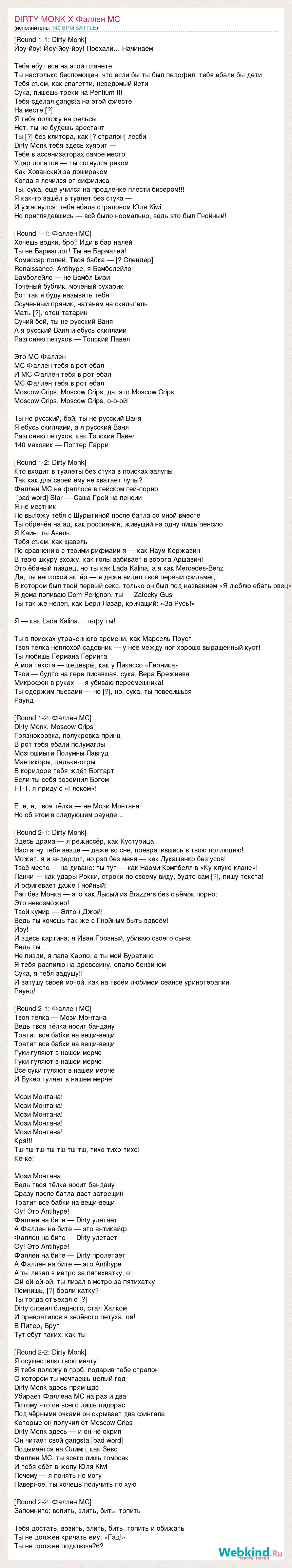 [Round 1-1: Dirty Monk] Йоу-йоу! Йоу-йоу-йоу! Поехали… Начинаем Тебя ебут все на этой планете Ты настолько беспомощен, что если бы ты был педофил, тебя ебали бы дети Тебя съем, как спагетти, неведомый йети Сука, пишешь треки на Pentium III Тебя сделал gangsta на этой фиесте На месте [?] Я тебя положу на рельсы Нет, ты не будешь арестант Ты [?] без клитора, как [? страпон] лесби Dirty Monk тебя здесь хуярит — Тебе в ассенизаторах самое место Удар лопатой — ты согнулся раком Как Хованский за дошираком Когда я лечился от сифилиса Ты, сука, ещё учился на продлёнке плести бисером!!! Я как-то зашёл в туалет без стука — И ужаснулся: тебя ебала страпоном Юля Kiwi Но приглядевшись — всё было нормально, ведь это был Гнойный! [Round 1-1: Фаллен MC] Хочешь водки, бро? Иди в бар налей Ты не Бармаглот! Ты не Бармалей! Комиссар полей. Твоя бабка — [? Слендер] Renaissance, Antihype, я Бамболейло Бамболейло — не Бамбл Бизи Точёный бублик, мочёный сухарик Вот так я буду называть тебя Ссученный пряник, натянем на скальпель Мать [?], отец татарин Сучий бой, ты не русский Ваня А я русский Ваня и ебусь скиллами Разгоняю петухов — Топский Павел Это MC Фаллен MC Фаллен тебя в рот ебал И MC Фаллен тебя в рот ебал MC Фаллен тебя в рот ебал Moscow Crips, Moscow Crips, да, это Moscow Crips Moscow Crips, Moscow Crips, о-о-ой! Ты не русский, бой, ты не русский Ваня Я ебусь скиллами, а я русский Ваня Разгоняю петухов, как Топский Павел 140 маховик — Поттер Гарри [Round 1-2: Dirty Monk] Кто входит в туалеты без стука в поисках залупы Так как для своей ему не хватает лупы? Фаллен MC на фаллосе в гейском гей-порно [bad word] Star — Саша Грей на пенсии Я не местник Но выложу тебя с Шурыгиной после батла со мной вместе Ты обречён на ад, как россиянин, живущий на одну лишь пенсию Я Каин, ты Авель Тебя съем, как щавель По сравнению с твоими рифмами я — как Наум Коржавин В твою шкуру вхожу, как голы забивает в ворота Аршавин! Это ёбаный пиздец, но ты как Lada Kalina, а я как Mercedes-Benz Да, ты неплохой актёр — я даже видел твой первый фильмец В котором был твой первый секс, только он был под названием «Я люблю ебать овец» Я дома попиваю Dom Perignon, ты — Zatecky Gus Ты так же нелеп, как Берл Лазар, кричащий: «За Русь!» Я — как Lada Kalina… тьфу ты! Ты в поисках утраченного времени, как Марсель Пруст Твоя тёлка неплохой садовник — у неё между ног хорошо выращенный куст! Ты любишь Германа Геринга А мои текста — шедевры, как у Пикассо «Герника» Твои — будто на гере писавшая, сука, Вера Брежнева Микрофон в руках — я убиваю пересмешника! Ты одержим пьесами — не [?], но, сука, ты повесишься Раунд [Round 1-2: Фаллен MC] Dirty Monk, Moscow Crips Грязнокровка, полукровка-принц В рот тебя ебали полумаглы Мозгошмыги Полумны Лавгуд Мантикоры, дядьки-огры В коридоре тебя ждёт Боггарт Если ты себя возомнил Богом F1-1, я приду с «Глоком»! Е, е, е, твоя тёлка — не Мози Монтана Но об этом в следующем раунде… [Round 2-1: Dirty Monk] Здесь драма — я режиссёр, как Кустурица Настигну тебя везде — даже во сне, превратившись в твою поллюцию! Может, я и андердог, но рэп без меня — как Лукашенко без усов! Твоё место — на диване: ты тут — как Наоми Кэмпбелл в «Ку-клукс-клане»! Панчи — как удары Рокки, строки по своему виду, будто сам [?], пишу текста! И офигевает даже Гнойный! Рэп без Монка — это как Лысый из Brazzers без съёмок порно: Это невозможно! Твой кумир — Элтон Джой! Ведь ты хочешь так же с Гнойным быть вдвоём! Йоу! И здесь картина: я Иван Грозный, убиваю своего сына Ведь ты… Не пизди, я папа Карло, 