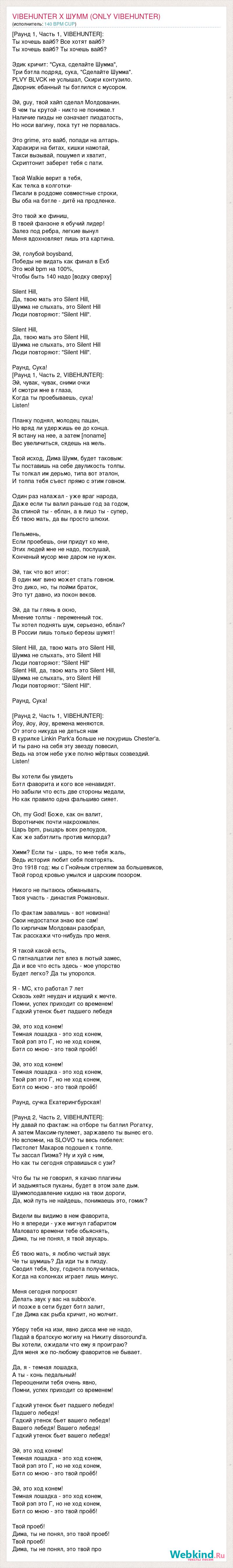 [Раунд 1, Часть 1, VIBEHUNTER]: Ты хочешь вайб? Все хотят вайб? Ты хочешь вайб? Ты хочешь вайб? Эдик кричит: "Сука, сделайте Шумма", Три бэтла подряд, сука, "Сделайте Шумма". PLVY BLVCK не услышал, Скири контузило. Дворник ебанный ты бэтлился с мусором. Эй, guy, твой хайп сделал Молдованин. В чем ты крутой - никто не понимае.т Наличие пизды не означает пиздатость, Но носи вагину, пока тут не порвалась. Это grime, это вайб, попади на алтарь. Харакири на битах, кишки намотай, Такси вызывай, пошумел и хватит, Скриптонит заберет тебя с пати. Твой Walkie верит в тебя, Как телка в колготки- Писали в роддоме совместные строки, Вы оба на бэтле - дитё на продленке. Это твой же финиш, В твоей фанзоне я ебучий лидер! Залез под ребра, легкие вынул Меня вдохновляет лишь эта картина. Эй, голубой boysband, Победы не видать как финал в Екб Это мой bpm на 100%, Чтобы быть 140 надо [водку сверху] Silent Hill, Да, твою мать это Silent Hill, Шумма не слыхать, это Silent Hill Люди повторяют: "Silent Hill". Silent Hill, Да, твою мать это Silent Hill, Шумма не слыхать, это Silent Hill Люди повторяют: "Silent Hill". Раунд, Сука! [Раунд 1, Часть 2, VIBEHUNTER]: Эй, чувак, чувак, сними очки И смотри мне в глаза, Когда ты проебываешь, сука! Listen! Планку поднял, молодец пацан, Но вряд ли удержишь ее до конца. Я встану на нее, а затем [noname] Вес увеличиться, сядешь на мель. Твой исход, Дима Шумм, будет таковым: Ты поставишь на себе двуликость толпы. Ты толкал им дерьмо, типа вот эталон, И толпа тебя съест прямо с этим говном. Один раз налажал - уже враг народа, Даже если ты валил раньше год за годом, За спиной ты - еблан, а в лицо ты - супер, Ёб твою мать, да вы просто шлюхи. Пельмень, Если проебешь, они придут ко мне, Этих людей мне не надо, послушай, Конченый мусор мне даром не нужен. Эй, так что вот итог: В один миг вино может стать говном. Это дико, но, ты пойми браток, Это тут давно, из покон веков. Эй, да ты глянь в окно, Мнение толпы - переменный ток. Ты хотел поднять шум, серьезно, еблан? В России лишь только березы шумят! Silent Hill, да, твою мать это Silent Hill, Шумма не слыхать, это Silent Hill Люди повторяют: "Silent Hill" Silent Hill, да, твою мать это Silent Hill, Шумма не слыхать, это Silent Hill Люди повторяют: "Silent Hill". Раунд, Сука! [Раунд 2, Часть 1, VIBEHUNTER]: Йоу, йоу, йоу, времена меняются. От этого никуда не деться нам В курилке Linkin Park'a больше не покуришь Chester'a. И ты рано на себя эту звезду повесил, Ведь на этом небе уже полно мёртвых созвездий. Listen! Вы хотели бы увидеть Бэтл фаворита и кого все ненавидят. Но забыли что есть две стороны медали, Но как правило одна фальшиво сияет. Oh, my God! Боже, как он валит, Воротничек почти накрохмален. Царь bpm, рыцарь всех релоудов, Как же забэтлить против милорда? Xммм? Если ты - царь, то мне тебя жаль, Ведь история любит себя повторять. Это 1918 год: мы с Гнойным стреляем за большевиков, Твой город кровью умылся и царским позором. Никого не пытаюсь обманывать, Твоя участь - династия Романовых. По фактам завалишь - вот новизна! Свои недостатки знаю все сам! По кирпичам Молдован разобрал, Так расскажи что-нибудь про меня. Я такой какой есть, С пятналцатии лет влез в лютый замес, Да и все что есть здесь - мое упорство Будет легко? Да ты упоролся. Я - МС, кто работал 7 лет Сквозь хейт неудач и идущий к мечте. Помни, успех приходит со временем! Гадкий утенок бьет падшего лебедя Эй, это ход конем! Темная лошадка - это ход конем, Твой рэп это Г, но не ход конем, Бэтл со мною - это твой проёб! Эй, это ход конем! Темная лошадка - это ход конем, 