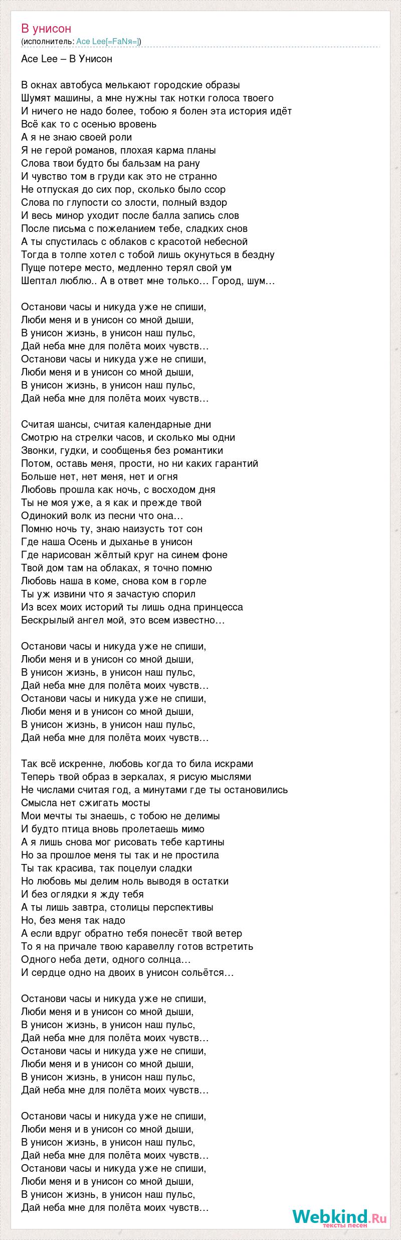 Ace Lee – В Унисон В окнах автобуса мелькают городские образы Шумят машины, а мне нужны так нотки голоса твоего И ничего не надо более, тобою я болен эта история идёт Всё как то с осенью вровень А я не знаю своей роли Я не герой романов, плохая карма планы Слова твои будто бы бальзам на рану И чувство том в груди как это не странно Не отпуская до сих пор, сколько было ссор Слова по глупости со злости, полный вздор И весь минор уходит после балла запись слов После письма с пожеланием тебе, сладких снов А ты спустилась с облаков с красотой небесной Тогда в толпе хотел с тобой лишь окунуться в бездну Пуще потере место, медленно терял свой ум Шептал люблю.. А в ответ мне только… Город, шум… Останови часы и никуда уже не спиши, Люби меня и в унисон со мной дыши, В унисон жизнь, в унисон наш пульс, Дай неба мне для полёта моих чувств… Останови часы и никуда уже не спиши, Люби меня и в унисон со мной дыши, В унисон жизнь, в унисон наш пульс, Дай неба мне для полёта моих чувств… Считая шансы, считая календарные дни Смотрю на стрелки часов, и сколько мы одни Звонки, гудки, и сообщенья без романтики Потом, оставь меня, прости, но ни каких гарантий Больше нет, нет меня, нет и огня Любовь прошла как ночь, с восходом дня Ты не моя уже, а я как и прежде твой Одинокий волк из песни что она… Помню ночь ту, знаю наизусть тот сон Где наша Осень и дыханье в унисон Где нарисован жёлтый круг на синем фоне Твой дом там на облаках, я точно помню Любовь наша в коме, снова ком в горле Ты уж извини что я зачастую спорил Из всех моих историй ты лишь одна принцесса Бескрылый ангел мой, это всем известно… Останови часы и никуда уже не спиши, Люби меня и в унисон со мной дыши, В унисон жизнь, в унисон наш пульс, Дай неба мне для полёта моих чувств… Останови часы и никуда уже не спиши, Люби меня и в унисон со мной дыши, В унисон жизнь, в унисон наш пульс, Дай неба мне для полёта моих чувств… Так всё искренне, любовь когда то била искрами Теперь твой образ в зеркалах, я рисую мыслями Не числами считая год, а минутами где ты остановились Смысла нет сжигать мосты Мои мечты ты знаешь, с тобою не делимы И будто птица вновь пролетаешь мимо А я лишь снова мог рисовать тебе картины Но за прошлое меня ты так и не простила Ты так красива, так поцелуи сладки Но любовь мы делим ноль выводя в остатки И без оглядки я жду тебя А ты лишь завтра, столицы перспективы Но, без меня так надо А если вдруг обратно тебя понесёт твой ветер То я на причале твою каравеллу готов встретить Одного неба дети, одного солнца… И сердце одно на двоих в унисон сольётся… Останови часы и никуда уже не спиши, Люби меня и в унисон со мной дыши, В унисон жизнь, в унисон наш пульс, Дай неба мне для полёта моих чувств… Останови часы и никуда уже не спиши, Люби меня и в унисон со мной дыши, В унисон жизнь, в унисон наш пульс, Дай неба мне для полёта моих чувств… Останови часы и никуда уже не спиши, Люби меня и в унисон со мной дыши, В унисон жизнь, в унисон наш пульс, Дай неба мне для полёта моих чувств… Останови часы и никуда уже не спиши, Люби меня и в унисон со мной дыши, В унисон жизнь, в унисон наш пульс, Дай неба мне для полёта моих чувств…