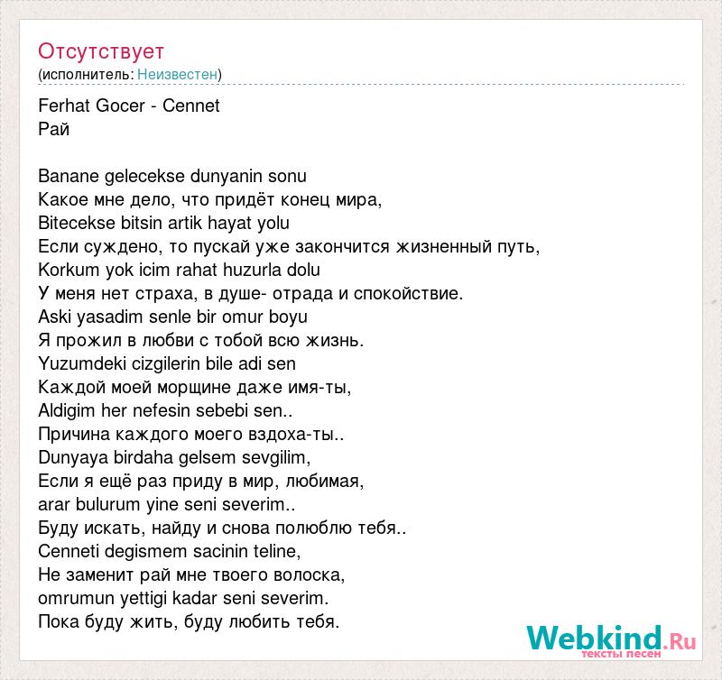 Ferhat Gocer - Cennet Рай Banane gelecekse dunyanin sonu Какое мне дело, что придёт конец мира, Bitecekse bitsin artik hayat yolu Если суждено, то пускай уже закончится жизненный путь, Korkum yok icim rahat huzurla dolu У меня нет страха, в душе- отрада и спокойствие. Aski yasadim senle bir omur boyu Я прожил в любви с тобой всю жизнь. Yuzumdeki cizgilerin bile adi sen Каждой моей морщине даже имя-ты, Aldigim her nefesin sebebi sen.. Причина каждого моего вздоха-ты.. Dunyaya birdaha gelsem sevgilim, Если я ещё раз приду в мир, любимая, arar bulurum yine seni severim.. Буду искать, найду и снова полюблю тебя.. Cenneti degismem sacinin teline, Не заменит рай мне твоего волоска, omrumun yettigi kadar seni severim. Пока буду жить, буду любить тебя.