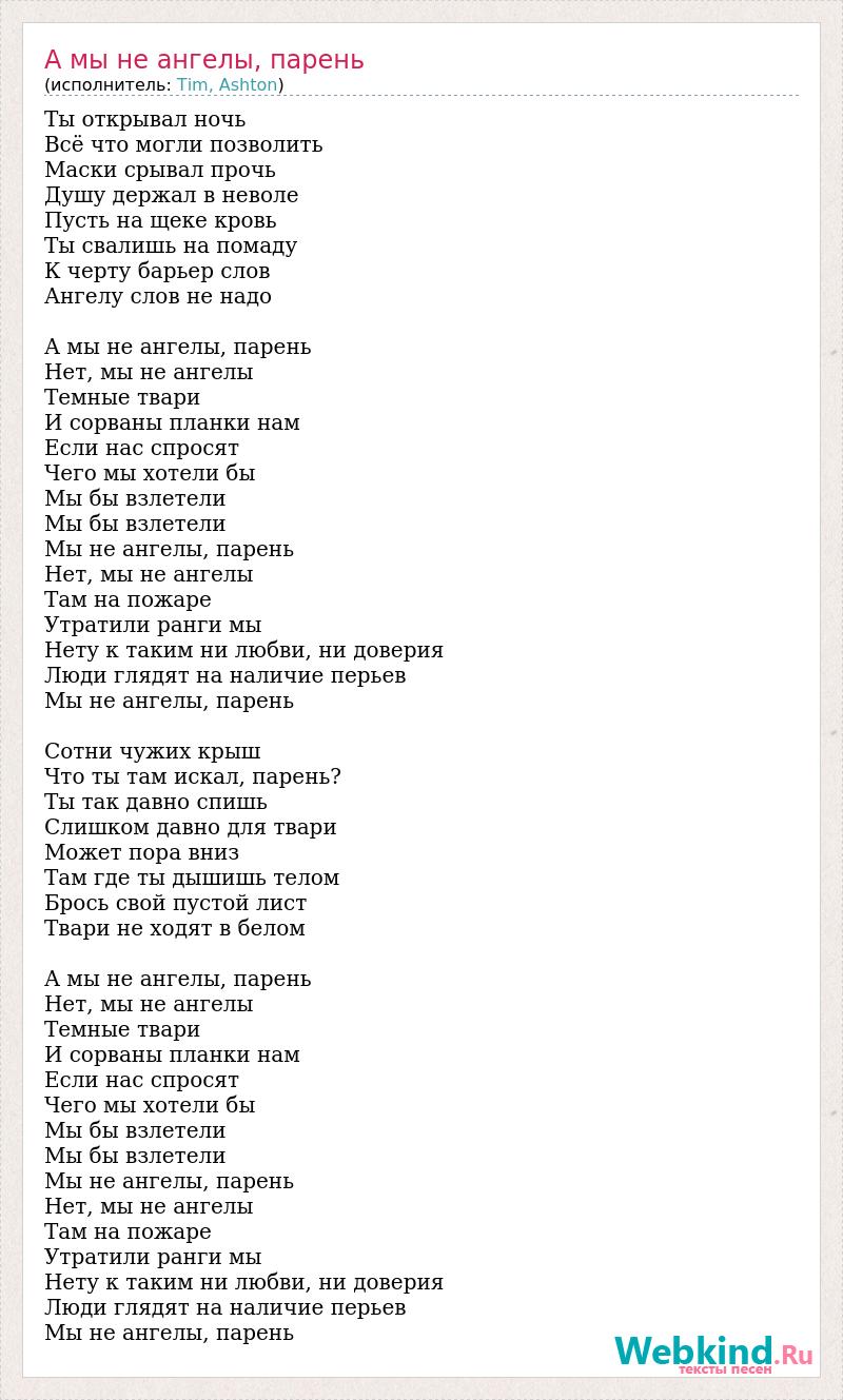 Ты открывал ночь Всё что могли позволить Маски срывал прочь Душу держал в неволе Пусть на щеке кровь Ты свалишь на помаду К черту барьер слов Ангелу слов не надо А мы не ангелы, парень Нет, мы не ангелы Темные твари И сорваны планки нам Если нас спросят Чего мы хотели бы Мы бы взлетели Мы бы взлетели Мы не ангелы, парень Нет, мы не ангелы Там на пожаре Утратили ранги мы Нету к таким ни любви, ни доверия Люди глядят на наличие перьев Мы не ангелы, парень Сотни чужих крыш Что ты там искал, парень? Ты так давно спишь Слишком давно для твари Может пора вниз Там где ты дышишь телом Брось свой пустой лист Твари не ходят в белом А мы не ангелы, парень Нет, мы не ангелы Темные твари И сорваны планки нам Если нас спросят Чего мы хотели бы Мы бы взлетели Мы бы взлетели Мы не ангелы, парень Нет, мы не ангелы Там на пожаре Утратили ранги мы Нету к таким ни любви, ни доверия Люди глядят на наличие перьев Мы не ангелы, парень