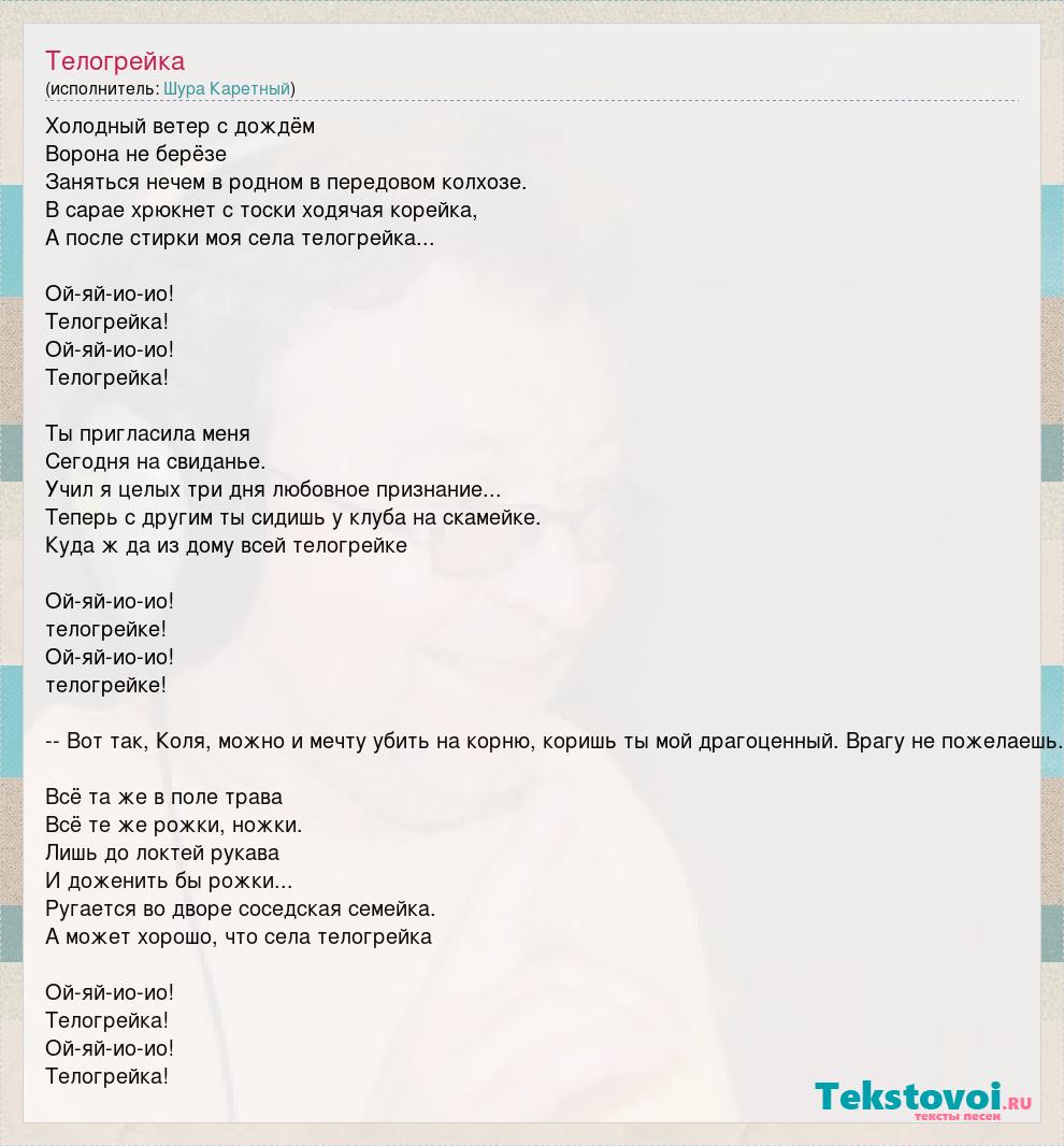 Холодный ветер с дождём Ворона не берёзе Заняться нечем в родном в передовом колхозе. В сарае хрюкнет с тоски ходячая корейка, А после стирки моя села телогрейка... Ой-яй-ио-ио! Телогрейка! Ой-яй-ио-ио! Телогрейка! Ты пригласила меня Сегодня на свиданье. Учил я целых три дня любовное признание... Теперь с другим ты сидишь у клуба на скамейке. Куда ж да из дому всей телогрейке Ой-яй-ио-ио! телогрейке! Ой-яй-ио-ио! телогрейке! -- Вот так, Коля, можно и мечту убить на корню, коришь ты мой драгоценный. Врагу не пожелаешь. Всё та же в поле трава Всё те же рожки, ножки. Лишь до локтей рукава И доженить бы рожки... Ругается во дворе соседская семейка. А может хорошо, что села телогрейка Ой-яй-ио-ио! Телогрейка! Ой-яй-ио-ио! Телогрейка!