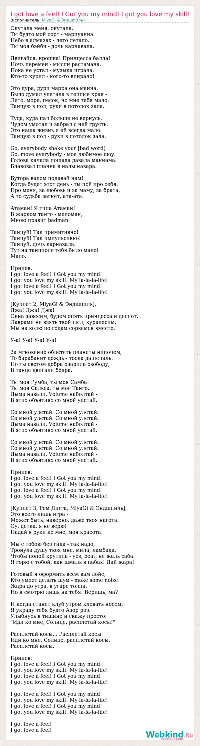Окутала меня, окутала. Ты будто мой сорт - мариуанна. Небо в алмазах - лето летало. Ты моя бэйби - дочь карнавала. Двигайся, крошка! Принцесса балла! Ночь перемен - мысли растамана. Пока не устал - музыка играла. Кто-то курил - кого-то впирало! Это дура, дури марра она манна. Было думал улетала в теплые края - Лето, море, песок, но мне тебя мало. Танцую в пол, руки в потолок зала. Туда, куда пал больше не вернусь. Чудом умотал и забрал с ней грусть. Это наша жизнь и ей всегда мало. Танцую в пол - руки в потолок зала. Go, everybody shake your [bad word] Go, move everybody - мое любимое шоу. Голова качала пощада давала маннама. Блавовал планна в налы навара. Бутора валом подавай нам! Когда будет этот день - ты пой про себя, Про меня, за любовь и за маму, за брата, А то судьба загнет, ата-ата! Атаман! Я типа Атаман! В жарком танго - меломан, Мною правит badman. Танцуй! Так примитивно! Танцуй! Так импульсивно! Танцуй, дочь карнавала. Тут на танцполе тебя было мало! Мало. Припев: I got love a feel! I Got you my mind! I got you love my skill! My la-la-la-life! I got love a feel! I Got you my mind! I got you love my skill! My la-la-la-life! [Куплет 2, MiyaGi & Эндшпиль]: Джа! Джа! Джа! Окна завесим, будем опять принцесса и деспот. Лаврами не взять твой пыл, куралесим. Мы на волю по годам сорвемся вместе. У-а! У-а! У-а! У-а! За мгновение облететь планеты нипочем, То барабанит дождь - тоска да печаль. Но ты светом добра озарила свободу, В танце двигали бёдра. Ты моя Румба, ты моя Самба! Ты моя Сальса, ты мое Танго. Дыма навали, Volume наболтай - В этих объятиях со мной улетай. Со мной улетай. Со мной улетай. Со мной улетай. Со мной улетай. Дыма навали, Volume наболтай - В этих объятиях со мной улетай. Со мной улетай. Со мной улетай. Со мной улетай. Со мной улетай. Дыма навали, Volume наболтай - В этих объятиях со мной улетай. Припев: I got love a feel! I Got you my mind! I got you love my skill! My la-la-la-life! I got love a feel! I Got you my mind! I got you love my skill! My la-la-la-life! [Куплет 3, Рем Дигга, MiyaGi & Эндшпиль]: Это всего лишь игра - Может быть, наверно, даже твоя нагота. Оу, детка, я не верю! Падай в руки ко мне, моя красота! Мы с тобою без гида - так надо, Тронула душу твоя мне, мила, ламбада. Чтобы попой крутила - yes, beat, не жаль саба. Я горю с тобой, как шмаль в пабах! Дай жара! Готовый я оформить всем вам лойс, Кто умеет делать шум - make some noize! Жара до утра, в угаре толпа, Но я смотрю лишь на тебя! Веришь, ма? И когда станет клуб утром клевать носом, Я украду тебя будто Азор роз. Улыбнусь в тишине и скажу просто: "Иди ко мне, Солнце, расплетай косы!" Расплетай косы... Расплетай косы. Иди ко мне, Солнце, расплетай косы. Расплетай косы. Припев: I got love a feel! I Got you my mind! I got you love my skill! My la-la-la-life! I got love a feel! I Got you my mind! I got you love my skill! My la-la-la-life! I got love a feel! I Got you my mind! I got you love my skill! My la-la-la-life! I got love a feel! I Got you my mind! I got you love my skill! My la-la-la-life! I got love a feel! I got love a feel!