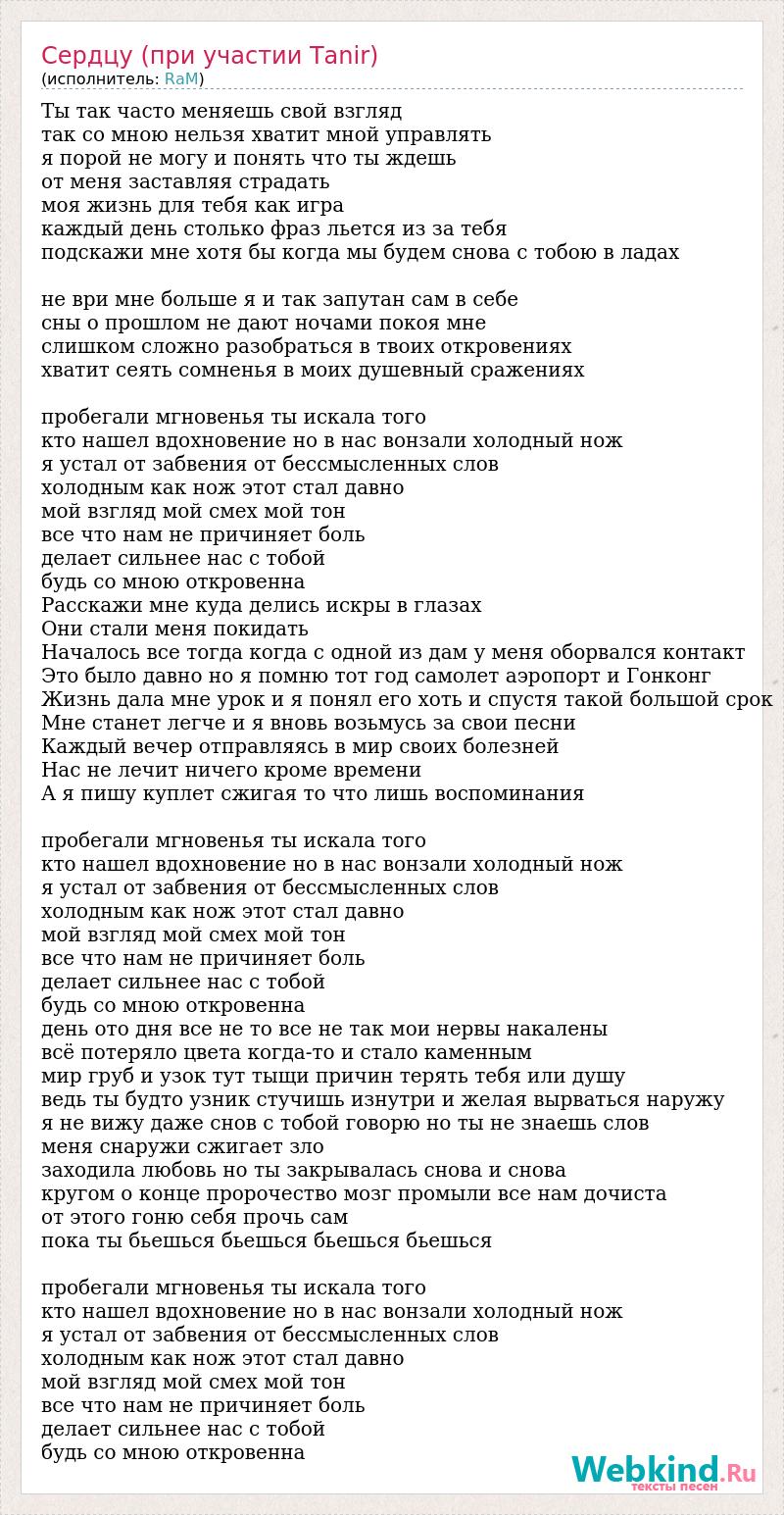 Ты так часто меняешь свой взгляд так со мною нельзя хватит мной управлять я порой не могу и понять что ты ждешь от меня заставляя страдать моя жизнь для тебя как игра каждый день столько фраз льется из за тебя подскажи мне хотя бы когда мы будем снова с тобою в ладах не ври мне больше я и так запутан сам в себе сны о прошлом не дают ночами покоя мне слишком сложно разобраться в твоих откровениях хватит сеять сомненья в моих душевный сражениях пробегали мгновенья ты искала того кто нашел вдохновение но в нас вонзали холодный нож я устал от забвения от бессмысленных слов холодным как нож этот стал давно мой взгляд мой смех мой тон все что нам не причиняет боль делает сильнее нас с тобой будь со мною откровенна Расскажи мне куда делись искры в глазах Они стали меня покидать Началось все тогда когда с одной из дам у меня оборвался контакт Это было давно но я помню тот год самолет аэропорт и Гонконг Жизнь дала мне урок и я понял его хоть и спустя такой большой срок Мне станет легче и я вновь возьмусь за свои песни Каждый вечер отправляясь в мир своих болезней Нас не лечит ничего кроме времени А я пишу куплет сжигая то что лишь воспоминания пробегали мгновенья ты искала того кто нашел вдохновение но в нас вонзали холодный нож я устал от забвения от бессмысленных слов холодным как нож этот стал давно мой взгляд мой смех мой тон все что нам не причиняет боль делает сильнее нас с тобой будь со мною откровенна день ото дня все не то все не так мои нервы накалены всё потеряло цвета когда-то и стало каменным мир груб и узок тут тыщи причин терять тебя или душу ведь ты будто узник стучишь изнутри и желая вырваться наружу я не вижу даже снов с тобой говорю но ты не знаешь слов меня снаружи сжигает зло заходила любовь но ты закрывалась снова и снова кругом о конце пророчество мозг промыли все нам дочиста от этого гоню себя прочь сам пока ты бьешься бьешься бьешься бьешься пробегали мгновенья ты искала того кто нашел вдохновение но в нас вонзали холодный нож я устал от забвения от бессмысленных слов холодным как нож этот стал давно мой взгляд мой смех мой тон все что нам не причиняет боль делает сильнее нас с тобой будь со мною откровенна