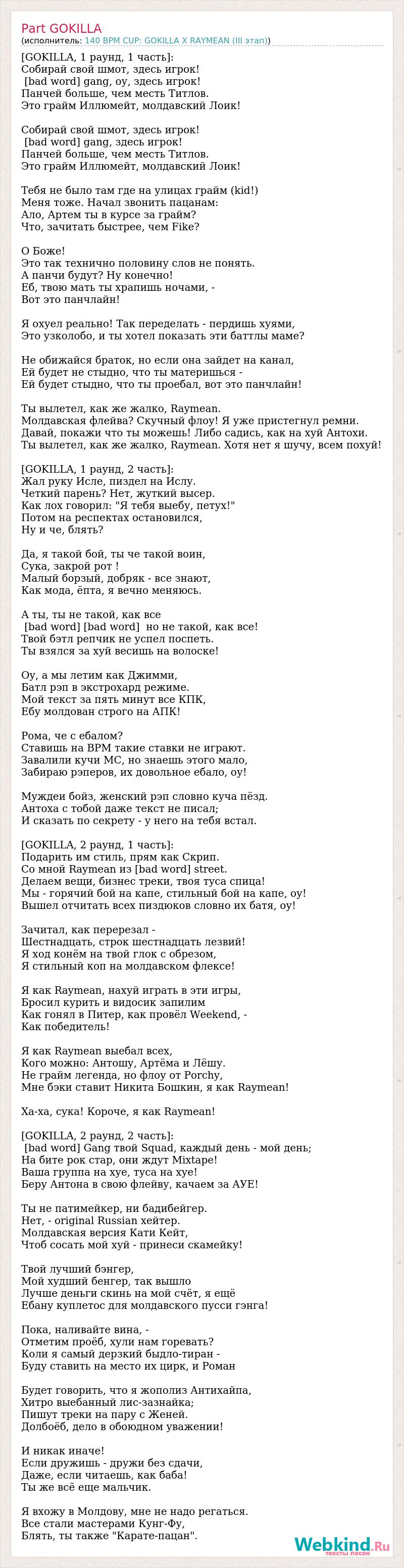 [GOKILLA, 1 раунд, 1 часть]: Собирай свой шмот, здесь игрок! [bad word] gang, оу, здесь игрок! Панчей больше, чем месть Титлов. Это грайм Иллюмейт, молдавский Лоик! Собирай свой шмот, здесь игрок! [bad word] gang, здесь игрок! Панчей больше, чем месть Титлов. Это грайм Иллюмейт, молдавский Лоик! Тебя не было там где на улицах грайм (kid!) Меня тоже. Начал звонить пацанам: Ало, Артем ты в курсе за грайм? Что, зачитать быстрее, чем Fike? О Боже! Это так технично половину слов не понять. А панчи будут? Ну конечно! Еб, твою мать ты храпишь ночами, - Вот это панчлайн! Я охуел реально! Так переделать - пердишь хуями, Это узколобо, и ты хотел показать эти баттлы маме? Не обижайся браток, но если она зайдет на канал, Ей будет не стыдно, что ты материшься - Ей будет стыдно, что ты проебал, вот это панчлайн! Ты вылетел, как же жалко, Raymean. Молдавская флейва? Скучный флоу! Я уже пристегнул ремни. Давай, покажи что ты можешь! Либо садись, как на хуй Антохи. Ты вылетел, как же жалко, Raymean. Хотя нет я шучу, всем похуй! [GOKILLA, 1 раунд, 2 часть]: Жал руку Исле, пиздел на Ислу. Четкий парень? Нет, жуткий высер. Как лох говорил: "Я тебя выебу, петух!" Потом на респектах остановился, Ну и че, блять? Да, я такой бой, ты че такой воин, Сука, закрой рот ! Малый борзый, добряк - все знают, Как мода, ёпта, я вечно меняюсь. А ты, ты не такой, как все [bad word] [bad word] но не такой, как все! Твой бэтл репчик не успел поспеть. Ты взялся за хуй весишь на волоске! Оу, а мы летим как Джимми, Батл рэп в экстрохард режиме. Мой текст за пять минут все КПК, Ебу молдован строго на АПК! Рома, че с ебалом? Ставишь на BPM такие ставки не играют. Завалили кучи MC, но знаешь этого мало, Забираю рэперов, их довольное ебало, оу! Муждеи бойз, женский рэп словно куча пёзд. Антоха с тобой даже текст не писал; И сказать по секрету - у него на тебя встал. [GOKILLA, 2 раунд, 1 часть]: Подарить им стиль, прям как Скрип. Со мной Raymean из [bad word] street. Делаем вещи, бизнес треки, твоя туса спица! Мы - горячий бой на капе, стильный бой на капе, оу! Вышел отчитать всех пиздюков словно их батя, оу! Зачитал, как перерезал - Шестнадцать, строк шестнадцать лезвий! Я ход конём на твой глок с обрезом, Я стильный коп на молдавском флексе! Я как Raymean, нахуй играть в эти игры, Бросил курить и видосик запилим Как гонял в Питер, как провёл Weekend, - Как победитель! Я как Raymean выебал всех, Кого можно: Антошу, Артёма и Лёшу. Не грайм легенда, но флоу от Porchy, Мне бэки ставит Никита Бошкин, я как Raymean! Ха-ха, сука! Короче, я как Raymean! [GOKILLA, 2 раунд, 2 часть]: [bad word] Gang твой Squad, каждый день - мой день; На бите рок стар, они ждут Mixtape! Ваша группа на хуе, туса на хуе! Беру Антона в свою флейву, качаем за АУЕ! Ты не патимейкер, ни бадибейгер. Нет, - original Russian хейтер. Молдавская версия Кати Кейт, Чтоб сосать мой хуй - принеси скамейку! Твой лучший бэнгер, Мой худший бенгер, так вышло Лучше деньги скинь на мой счёт, я ещё Ебану куплетос для молдавского пусси гэнга! Пока, наливайте вина, - Отметим проёб, хули нам горевать? Коли я самый дерзкий быдло-тиран - Буду ставить на место их цирк, и Роман Будет говорить, что я жополиз Антихайпа, Хитро выебанный лис-зазнайка; Пишут треки на пару с Женей. Долбоёб, дело в обоюдном уважении! И никак иначе! Если дружишь - дружи без сдачи, Даже, если читаешь, как баба! Ты же всё еще мальчик. Я вхожу в Молдову, мне не надо регаться. Все стали мастерами Кунг-Фу, Блять, ты также "Карате-пацан".