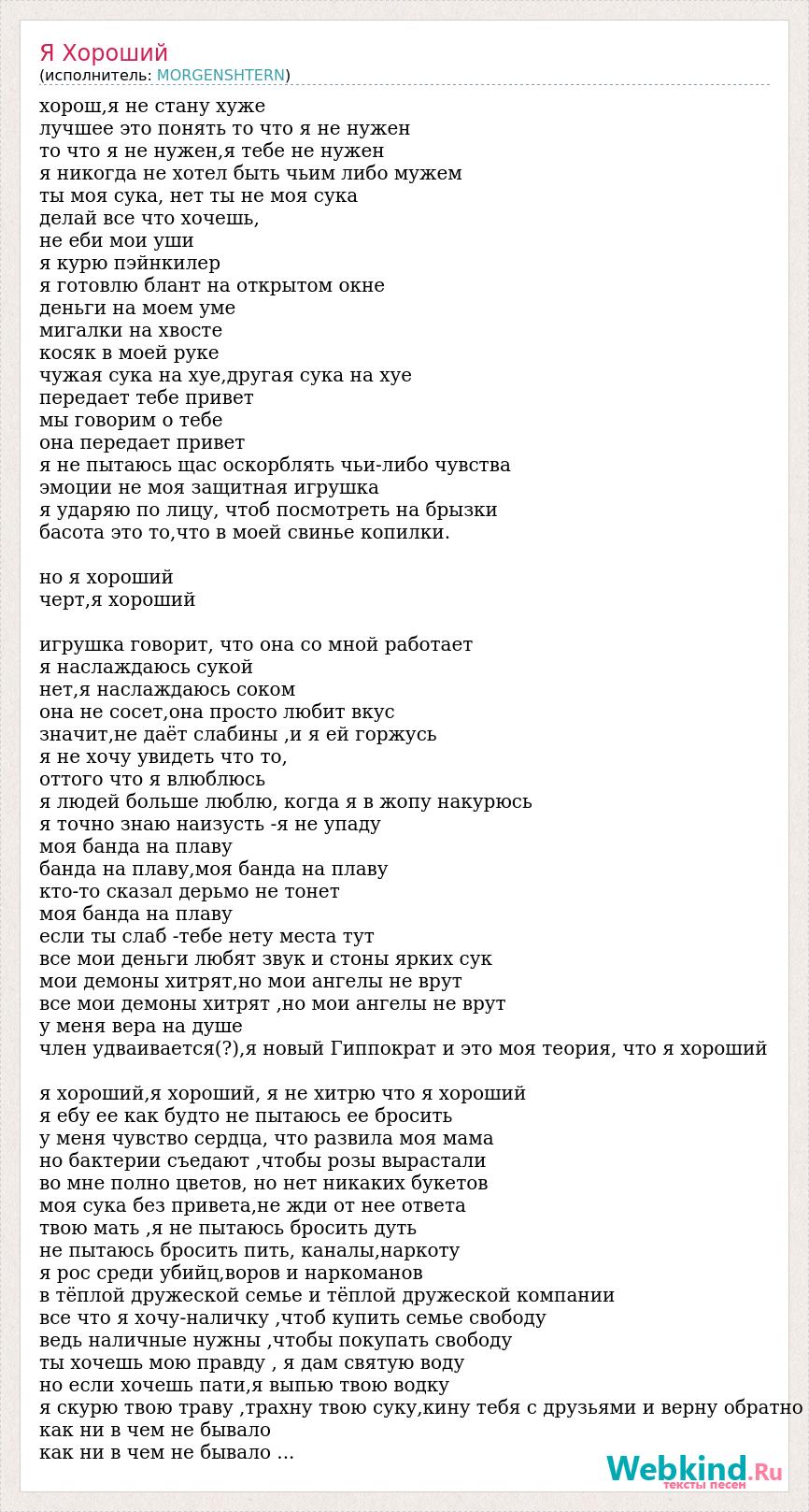хорош,я не стану хуже лучшее это понять то что я не нужен то что я не нужен,я тебе не нужен я никогда не хотел быть чьим либо мужем ты моя сука, нет ты не моя сука делай все что хочешь, не еби мои уши я курю пэйнкилер я готовлю блант на открытом окне деньги на моем уме мигалки на хвосте косяк в моей руке чужая сука на хуе,другая сука на хуе передает тебе привет мы говорим о тебе она передает привет я не пытаюсь щас оскорблять чьи-либо чувства эмоции не моя защитная игрушка я ударяю по лицу, чтоб посмотреть на брызки басота это то,что в моей свинье копилки. но я хороший черт,я хороший игрушка говорит, что она со мной работает я наслаждаюсь сукой нет,я наслаждаюсь соком она не сосет,она просто любит вкус значит,не даёт слабины ,и я ей горжусь я не хочу увидеть что то, оттого что я влюблюсь я людей больше люблю, когда я в жопу накурюсь я точно знаю наизусть -я не упаду моя банда на плаву банда на плаву,моя банда на плаву кто-то сказал дерьмо не тонет моя банда на плаву если ты слаб -тебе нету места тут все мои деньги любят звук и стоны ярких сук мои демоны хитрят,но мои ангелы не врут все мои демоны хитрят ,но мои ангелы не врут у меня вера на душе член удваивается(?),я новый Гиппократ и это моя теория, что я хороший я хороший,я хороший, я не хитрю что я хороший я ебу ее как будто не пытаюсь ее бросить у меня чувство сердца, что развила моя мама но бактерии съедают ,чтобы розы вырастали во мне полно цветов, но нет никаких букетов моя сука без привета,не жди от нее ответа твою мать ,я не пытаюсь бросить дуть не пытаюсь бросить пить, каналы,наркоту я рос среди убийц,воров и наркоманов в тёплой дружеской семье и тёплой дружеской компании все что я хочу-наличку ,чтоб купить семье свободу ведь наличные нужны ,чтобы покупать свободу ты хочешь мою правду , я дам святую воду но если хочешь пати,я выпью твою водку я скурю твою траву ,трахну твою суку,кину тебя с друзьями и верну обратно как ни в чем не бывало как ни в чем не бывало ...