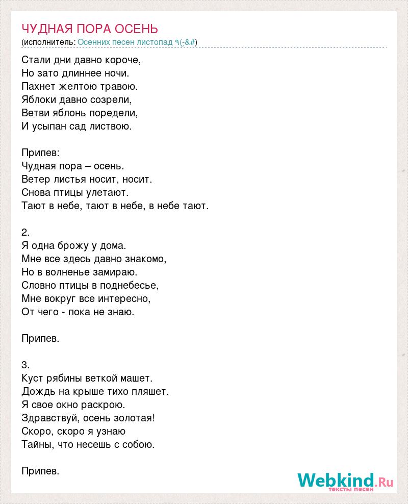 Стали дни давно короче, Но зато длиннее ночи. Пахнет желтою травою. Яблоки давно созрели, Ветви яблонь поредели, И усыпан сад листвою. Припев: Чудная пора – осень. Ветер листья носит, носит. Снова птицы улетают. Тают в небе, тают в небе, в небе тают. 2. Я одна брожу у дома. Мне все здесь давно знакомо, Но в волненье замираю. Словно птицы в поднебесье, Мне вокруг все интересно, От чего - пока не знаю. Припев. 3. Куст рябины веткой машет. Дождь на крыше тихо пляшет. Я свое окно раскрою. Здравствуй, осень золотая! Скоро, скоро я узнаю Тайны, что несешь с собою. Припев.