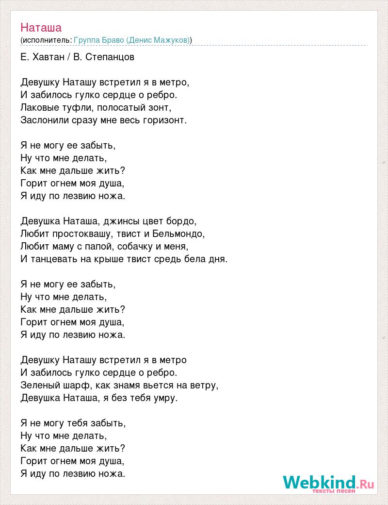 Е. Хавтан / В. Степанцов Девушку Наташу встретил я в метро, И забилось гулко сердце о ребро. Лаковые туфли, полосатый зонт, Заслонили сразу мне весь горизонт. Я не могу ее забыть, Ну что мне делать, Как мне дальше жить? Горит огнем моя душа, Я иду по лезвию ножа. Девушка Наташа, джинсы цвет бордо, Любит простоквашу, твист и Бельмондо, Любит маму с папой, собачку и меня, И танцевать на крыше твист средь бела дня. Я не могу ее забыть, Ну что мне делать, Как мне дальше жить? Горит огнем моя душа, Я иду по лезвию ножа. Девушку Наташу встретил я в метро И забилось гулко сердце о ребро. Зеленый шарф, как знамя вьется на ветру, Девушка Наташа, я без тебя умру. Я не могу тебя забыть, Ну что мне делать, Как мне дальше жить? Горит огнем моя душа, Я иду по лезвию ножа.