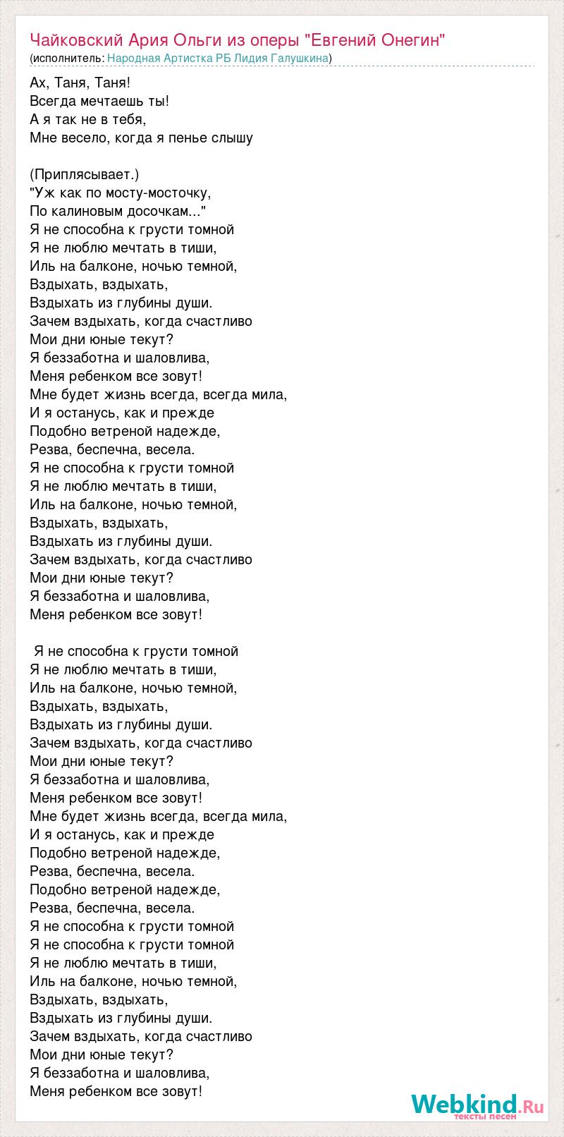 Ах, Таня, Таня! Всегда мечтаешь ты! А я так не в тебя, Мне весело, когда я пенье слышу (Приплясывает.) "Уж как по мосту-мосточку, По калиновым досочкам..." Я не способна к грусти томной Я не люблю мечтать в тиши, Иль на балконе, ночью темной, Вздыхать, вздыхать, Вздыхать из глубины души. Зачем вздыхать, когда счастливо Мои дни юные текут? Я беззаботна и шаловлива, Меня ребенком все зовут! Мне будет жизнь всегда, всегда мила, И я останусь, как и прежде Подобно ветреной надежде, Резва, беспечна, весела. Я не способна к грусти томной Я не люблю мечтать в тиши, Иль на балконе, ночью темной, Вздыхать, вздыхать, Вздыхать из глубины души. Зачем вздыхать, когда счастливо Мои дни юные текут? Я беззаботна и шаловлива, Меня ребенком все зовут! Я не способна к грусти томной Я не люблю мечтать в тиши, Иль на балконе, ночью темной, Вздыхать, вздыхать, Вздыхать из глубины души. Зачем вздыхать, когда счастливо Мои дни юные текут? Я беззаботна и шаловлива, Меня ребенком все зовут! Мне будет жизнь всегда, всегда мила, И я останусь, как и прежде Подобно ветреной надежде, Резва, беспечна, весела. Подобно ветреной надежде, Резва, беспечна, весела. Я не способна к грусти томной Я не способна к грусти томной Я не люблю мечтать в тиши, Иль на балконе, ночью темной, Вздыхать, вздыхать, Вздыхать из глубины души. Зачем вздыхать, когда счастливо Мои дни юные текут? Я беззаботна и шаловлива, Меня ребенком все зовут!
