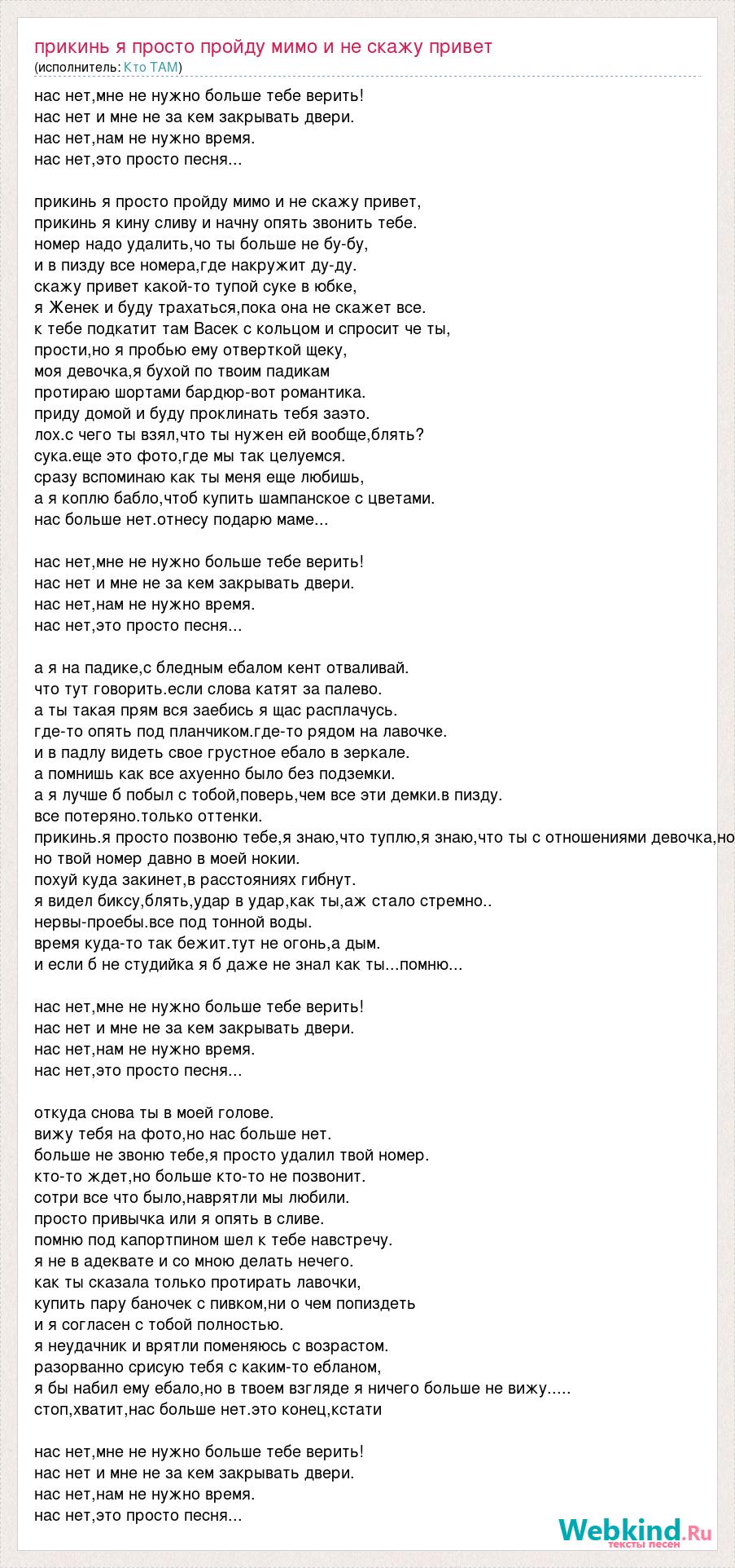 нас нет,мне не нужно больше тебе верить! нас нет и мне не за кем закрывать двери. нас нет,нам не нужно время. нас нет,это просто песня... прикинь я просто пройду мимо и не скажу привет, прикинь я кину сливу и начну опять звонить тебе. номер надо удалить,чо ты больше не бу-бу, и в пизду все номера,где накружит ду-ду. скажу привет какой-то тупой суке в юбке, я Женек и буду трахаться,пока она не скажет все. к тебе подкатит там Васек с кольцом и спросит че ты, прости,но я пробью ему отверткой щеку, моя девочка,я бухой по твоим падикам протираю шортами бардюр-вот романтика. приду домой и буду проклинать тебя заэто. лох.с чего ты взял,что ты нужен ей вообще,блять? сука.еще это фото,где мы так целуемся. сразу вспоминаю как ты меня еще любишь, а я коплю бабло,чтоб купить шампанское с цветами. нас больше нет.отнесу подарю маме... нас нет,мне не нужно больше тебе верить! нас нет и мне не за кем закрывать двери. нас нет,нам не нужно время. нас нет,это просто песня... а я на падике,с бледным ебалом кент отваливай. что тут говорить.если слова катят за палево. а ты такая прям вся заебись я щас расплачусь. где-то опять под планчиком.где-то рядом на лавочке. и в падлу видеть свое грустное ебало в зеркале. а помнишь как все ахуенно было без подземки. а я лучше б побыл с тобой,поверь,чем все эти демки.в пизду. все потеряно.только оттенки. прикинь.я просто позвоню тебе,я знаю,что туплю,я знаю,что ты с отношениями девочка,но но твой номер давно в моей нокии. похуй куда закинет,в расстояниях гибнут. я видел биксу,блять,удар в удар,как ты,аж стало стремно.. нервы-проебы.все под тонной воды. время куда-то так бежит.тут не огонь,а дым. и если б не студийка я б даже не знал как ты...помню... нас нет,мне не нужно больше тебе верить! нас нет и мне не за кем закрывать двери. нас нет,нам не нужно время. нас нет,это просто песня... откуда снова ты в моей голове. вижу тебя на фото,но нас больше нет. больше не звоню тебе,я просто удалил твой номер. кто-то ждет,но больше кто-то не позвонит. сотри все что было,наврятли мы любили. просто привычка или я опять в сливе. помню под капортпином шел к тебе навстречу. я не в адеквате и со мною делать нечего. как ты сказала только протирать лавочки, купить пару баночек с пивком,ни о чем попиздеть и я согласен с тобой полностью. я неудачник и врятли поменяюсь с возрастом. разорванно срисую тебя с каким-то ебланом, я бы набил ему ебало,но в твоем взгляде я ничего больше не вижу..... стоп,хватит,нас больше нет.это конец,кстати нас нет,мне не нужно больше тебе верить! нас нет и мне не за кем закрывать двери. нас нет,нам не нужно время. нас нет,это просто песня...