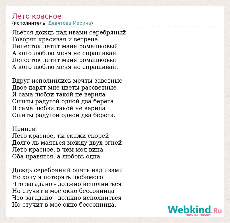 Льётся дождь над ивами серебряный Говорят красивая и ветрена Лепесток летит маня ромашковый А кого люблю меня не спрашивай Лепесток летит маня ромашковый А кого люблю меня не спрашивай. Вдруг исполнились мечты заветные Двое дарят мне цветы рассветные Я сама любви такой не верила Сшиты радугой одной два берега Я сама любви такой не верила Сшиты радугой одной два берега. Припев: Лето красное, ты скажи скорей Долго ль маяться между двух огней Лето красное, в чём моя вина Оба нравятся, а любовь одна. Дождь серебряный опять над ивами Не хочу я потерять любимого Что загадано - должно исполниться Но стучит в моё окно бессонница Что загадано - должно исполниться Но стучит в моё окно бессонница.