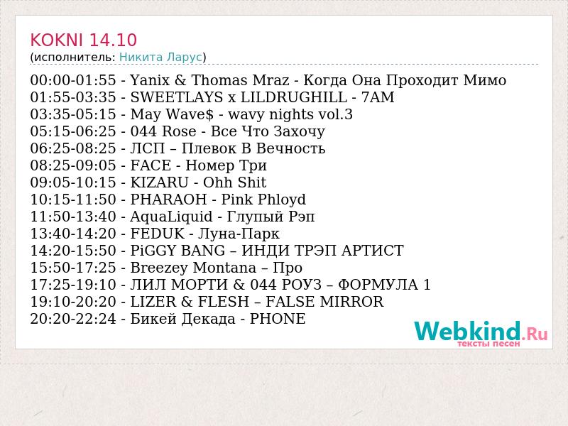 00:00-01:55 - Yanix & Thomas Mraz - Когда Она Проходит Мимо 01:55-03:35 - SWEETLAYS x LILDRUGHILL - 7AM 03:35-05:15 - May Wave$ - wavy nights vol.3 05:15-06:25 - 044 Rose - Все Что Захочу 06:25-08:25 - ЛСП – Плевок В Вечность 08:25-09:05 - FACE - Номер Три 09:05-10:15 - KIZARU - Ohh Shit 10:15-11:50 - PHARAOH - Pink Phloyd 11:50-13:40 - AquaLiquid - Глупый Рэп 13:40-14:20 - FEDUK - Луна-Парк 14:20-15:50 - PiGGY BANG – ИНДИ ТРЭП АРТИСТ 15:50-17:25 - Breezey Montana – Про 17:25-19:10 - ЛИЛ МОРТИ & 044 РОУЗ – ФОРМУЛА 1 19:10-20:20 - LIZER & FLESH – FALSE MIRROR 20:20-22:24 - Бикей Декада - PHONE