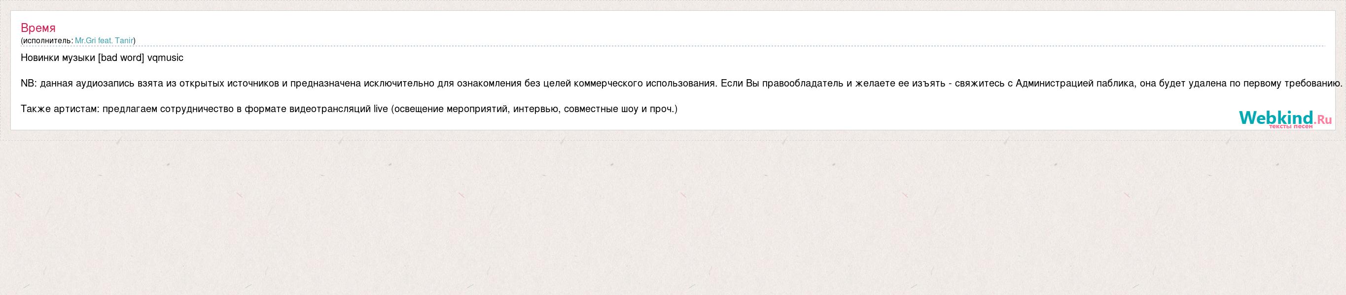 Новинки музыки [bad word] vqmusic NB: данная аудиозапись взята из открытых источников и предназначена исключительно для ознакомления без целей коммерческого использования. Если Вы правообладатель и желаете ее изъять - свяжитесь с Администрацией паблика, она будет удалена по первому требованию. Также артистам: предлагаем сотрудничество в формате видеотрансляций live (освещение мероприятий, интервью, совместные шоу и проч.)