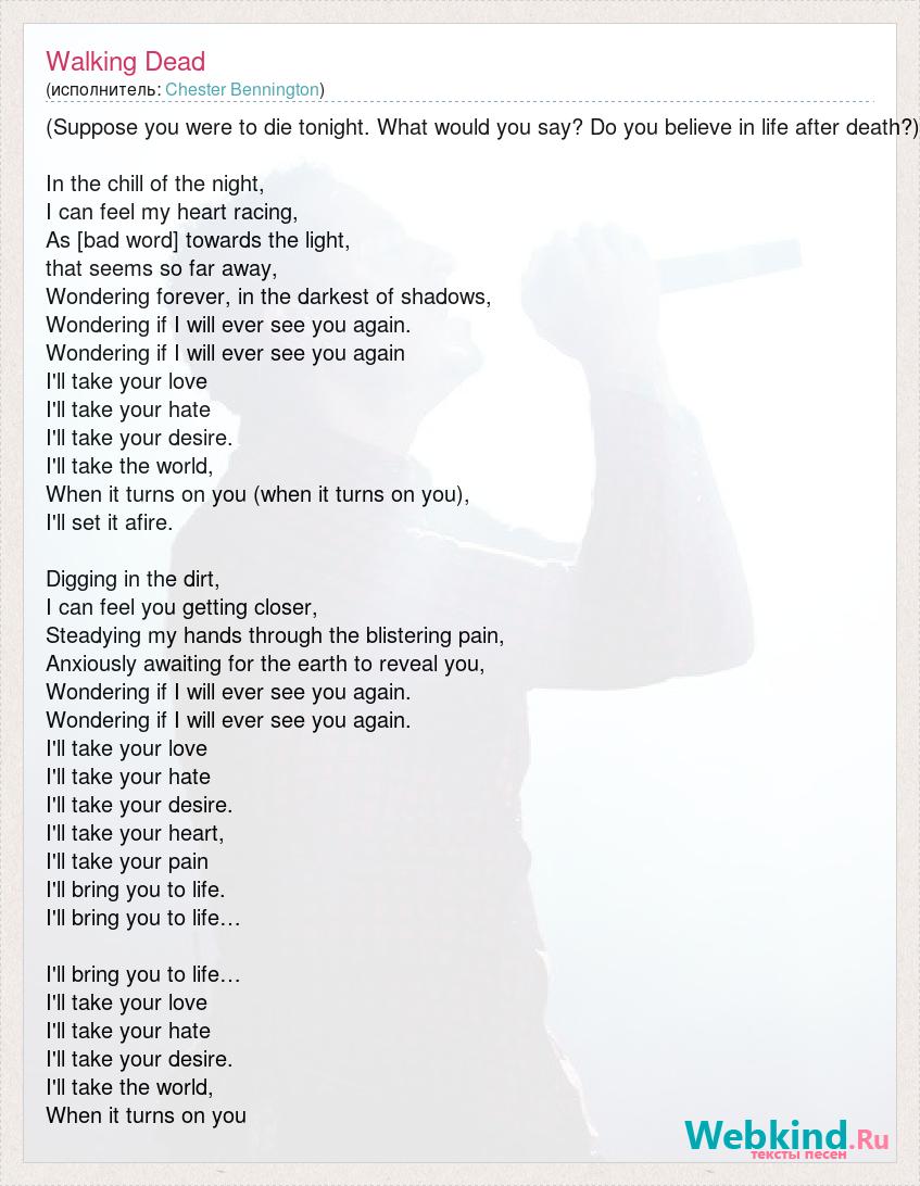 (Suppose you were to die tonight. What would you say? Do you believe in life after death?) In the chill of the night, I can feel my heart racing, As [bad word] towards the light, that seems so far away, Wondering forever, in the darkest of shadows, Wondering if I will ever see you again. Wondering if I will ever see you again I'll take your love I'll take your hate I'll take your desire. I'll take the world, When it turns on you (when it turns on you), I'll set it afire. Digging in the dirt, I can feel you getting closer, Steadying my hands through the blistering pain, Anxiously awaiting for the earth to reveal you, Wondering if I will ever see you again. Wondering if I will ever see you again. I'll take your love I'll take your hate I'll take your desire. I'll take your heart, I'll take your pain I'll bring you to life. I'll bring you to life… I'll bring you to life… I'll take your love I'll take your hate I'll take your desire. I'll take the world, When it turns on you