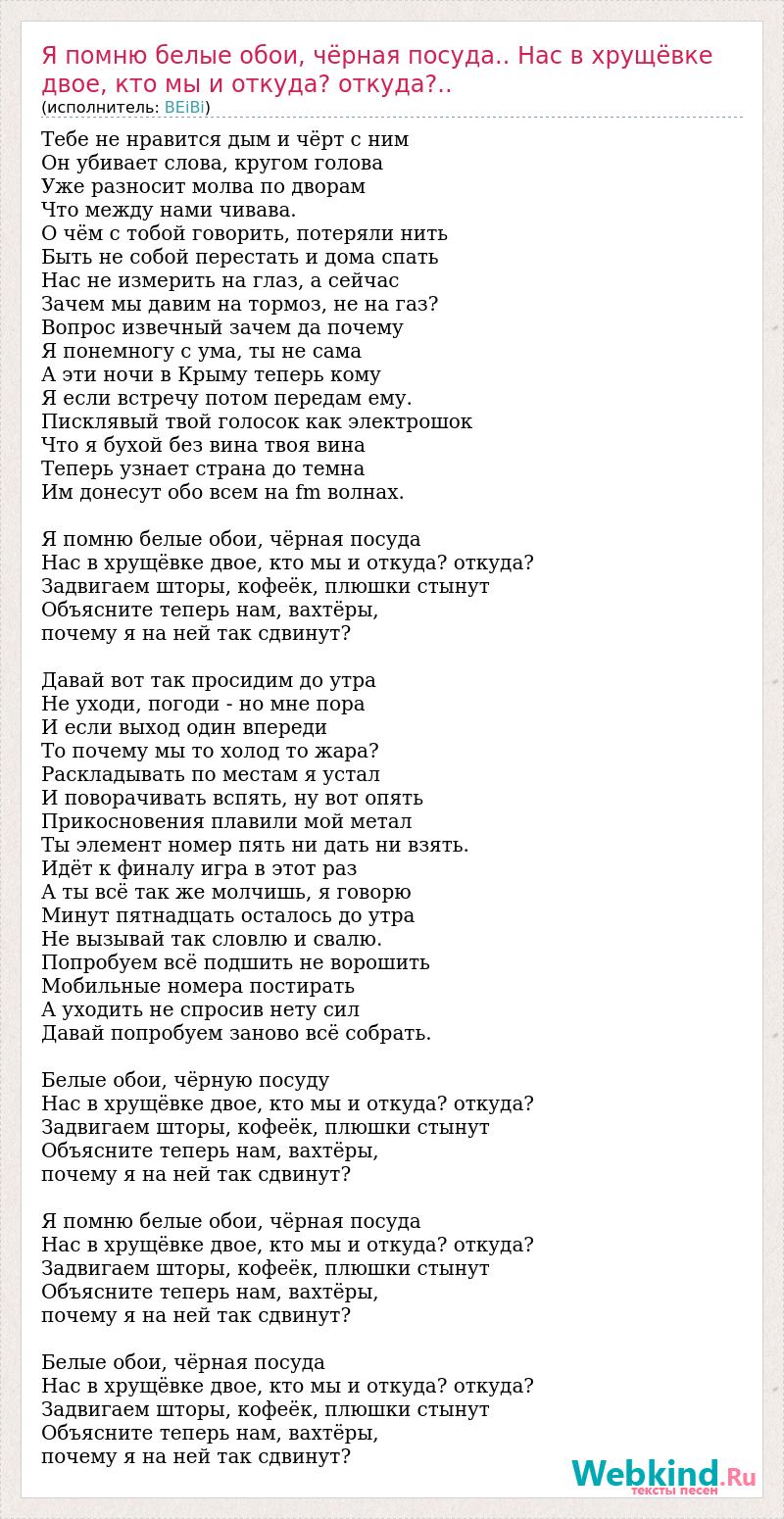 Тебе не нравится дым и чёрт с ним Он убивает слова, кругом голова Уже разносит молва по дворам Что между нами чивава. О чём с тобой говорить, потеряли нить Быть не собой перестать и дома спать Нас не измерить на глаз, а сейчас Зачем мы давим на тормоз, не на газ? Вопрос извечный зачем да почему Я понемногу с ума, ты не сама А эти ночи в Крыму теперь кому Я если встречу потом передам ему. Писклявый твой голосок как электрошок Что я бухой без вина твоя вина Теперь узнает страна до темна Им донесут обо всем на fm волнах. Я помню белые обои, чёрная посуда Нас в хрущёвке двое, кто мы и откуда? откуда? Задвигаем шторы, кофеёк, плюшки стынут Объясните теперь нам, вахтёры, почему я на ней так сдвинут? Давай вот так просидим до утра Не уходи, погоди - но мне пора И если выход один впереди То почему мы то холод то жара? Раскладывать по местам я устал И поворачивать вспять, ну вот опять Прикосновения плавили мой метал Ты элемент номер пять ни дать ни взять. Идёт к финалу игра в этот раз А ты всё так же молчишь, я говорю Минут пятнадцать осталось до утра Не вызывай так словлю и свалю. Попробуем всё подшить не ворошить Мобильные номера постирать А уходить не спросив нету сил Давай попробуем заново всё собрать. Белые обои, чёрную посуду Нас в хрущёвке двое, кто мы и откуда? откуда? Задвигаем шторы, кофеёк, плюшки стынут Объясните теперь нам, вахтёры, почему я на ней так сдвинут? Я помню белые обои, чёрная посуда Нас в хрущёвке двое, кто мы и откуда? откуда? Задвигаем шторы, кофеёк, плюшки стынут Объясните теперь нам, вахтёры, почему я на ней так сдвинут? Белые обои, чёрная посуда Нас в хрущёвке двое, кто мы и откуда? откуда? Задвигаем шторы, кофеёк, плюшки стынут Объясните теперь нам, вахтёры, почему я на ней так сдвинут?