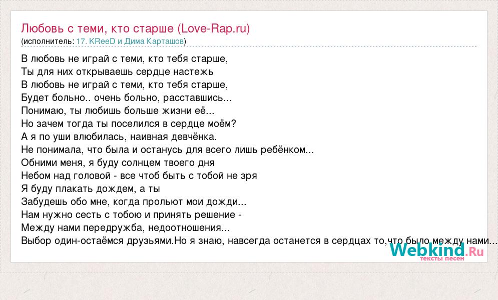 В любовь не играй с теми, кто тебя старше, Ты для них открываешь сердце настежь В любовь не играй с теми, кто тебя старше, Будет больно.. очень больно, расставшись... Понимаю, ты любишь больше жизни её... Но зачем тогда ты поселился в сердце моём? А я по уши влюбилась, наивная девчёнка. Не понимала, что была и останусь для всего лишь ребёнком... Обними меня, я буду солнцем твоего дня Небом над головой - все чтоб быть с тобой не зря Я буду плакать дождем, а ты Забудешь обо мне, когда прольют мои дожди... Нам нужно сесть с тобою и принять решение - Между нами передружба, недоотношения... Выбор один-остаёмся друзьями.Но я знаю, навсегда останется в сердцах то,что было между нами...