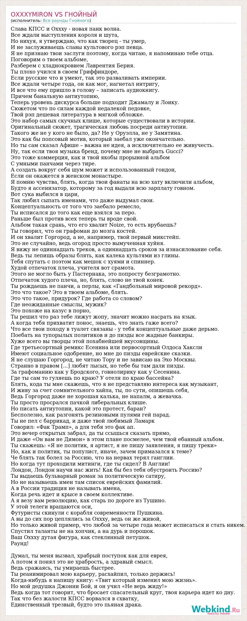 Слава КПСС и Oxxxy - новая панк волна. Все ждали выступления короля и шута, Но нихуя, я утверждаю, что как творец - ты умер, И не заслуживаешь славы культового рэп певца. Я не признаю твои заслуги поэтому, когда читаю, я напоминаю тебе отца. Поговорим о твоем альбоме, Разберем с хладнокровием Лаврентия Берия. Ты плохо учился в своем Гриффиндоре, Если русские что и умеют, так это разваливать империи. Все ждали четыре года, он как мог, нагнетал интригу, И все что ему пришло в голову – записать аудиокнигу. Причем банальную антиутопию, Теперь уровень дискурса больше подходит Джамалу и Лоику. Сюжетом что по силам каждой недалекой педовке, Твой рэп дешевая литература в мягкой обложке. Это набор самых скучных клише, которые существовали в истории. Оригинальный сюжет, трагическая любовь посреди антиутопии. Такого же не у кого не было, да? Не у Оруэлла, не у Замятина. Это как бы попсовый мотив, который заебал уже окончательно. Но ты сам сказал Афише – важна не идея, а исключительно ее живучесть. Ну, так если твоя музыка бренд, почему мне не выбрать Gucci? Это тоже коммерция, как и твой якобы прорывной альбом С умными панчами через тире. А создать вокруг себя шум может и использованный гондон, Если он окажется в женском монастыре. Я помню чувства, блять, когда твои фанаты на всю хату включили альбом, Будто я ассенизатор, которому за год выдали всю зарплату говном. Вот сука выбился в цари, Так любил сыпать именами, что даже выдумал свои. Концептуальность от того что заебало ремесло, Ты исписался до того как еще взялся за перо. Раньше был против всех теперь ты вроде свой. Альбом такая срань, что его хвалит Noize, то есть врубаешь? Ты говорил, что он графоман до мозга костей. И он хвалит Горгород, а не, например, твой первый микстейп. Это не случайно, ведь огород просто вымученная хуйня. Я вижу не одиннадцать треков, а одиннадцать сроков за изнасилование себя. Ведь ты лепишь образы блять, как калека культями из глины. Тебя спутать с поэтом как мешок с хуями и спиннер. Худой отпечаток плеча, учителя вот срамота. Этого не могло быть у Пастернака, это попросту безграмотно. Отпечаток худого плеча, но, блять, слово не твой конек. Ты рождаешь не панчи, а перлы, как «Гандбольный мировой рекорд». Это что такое? Это в твоем альбоме, блять. Это что такое, придурок? Где работа со словом? Где неожиданные смыслы, мужик? Это похоже на казус в порно, Ты решил что раз тебе лижут жопу, значит можно насрать на язык. А когда тебя прихватит понос, знаешь, что знать гаже всего? Что все твои походу в туалет связаны - у тебя концептуальные даже дерьмо. Поебать на тупорылых политиков и до пизды все жадные банкиры. Хуже всего вы творцы этой похабнейшей вкусовщины. Где третьесортный ремикс Есенина или первосортный Олдоса Хаксли Имеют социальное одобрение, но мне до пизды еврейские сказки. Я не слушаю Горгород, не читаю Тору и не зависаю на Эхо Москвы. Странно в правом [...] любят лысых, но тебе бы там дали пизды. За графоманию как у Бродского, говнолирику как у Сесенина. Где ты сам то гуляешь по краю? У отеля по краю бассейна? Блять, кода ты мне скажешь, что я не представляю интереса как музыкант, И живу за счет сомнительного хайпа, ты, по сути, опишешь себя, Ведь Горгород даже не хорошая калька, не напалм, а жевачка. Ты просто просрался пачкой либеральных клише. Но писать антиутопии, какой это протест, баран? Бесполезно, 