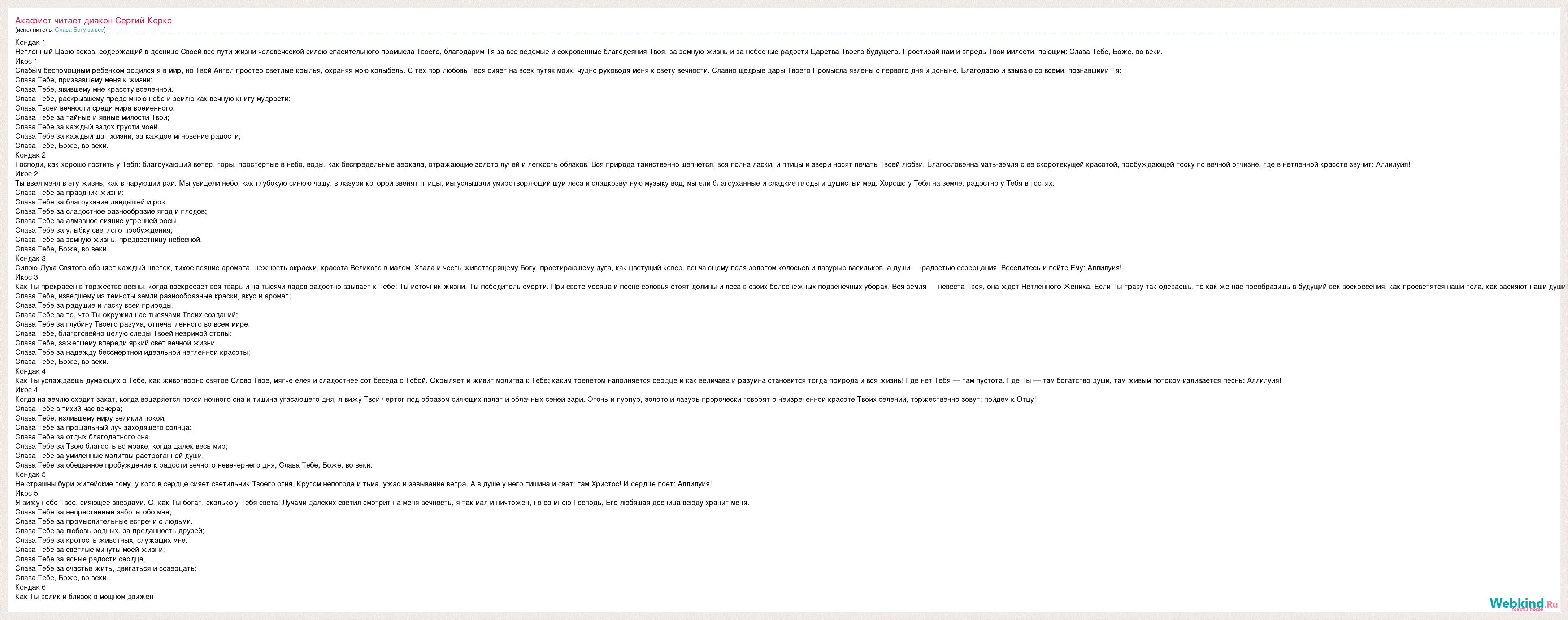 Кондак 1 Нетленный Царю веков, содержащий в деснице Своей все пути жизни человеческой силою спасительного промысла Твоего, благодарим Тя за все ведомые и сокровенные благодеяния Твоя, за земную жизнь и за небесные радости Царства Твоего будущего. Простирай нам и впредь Твои милости, поющим: Слава Тебе, Боже, во веки. Икос 1 Слабым беспомощным ребенком родился я в мир, но Твой Ангел простер светлые крылья, охраняя мою колыбель. С тех пор любовь Твоя сияет на всех путях моих, чудно руководя меня к свету вечности. Славно щедрые дары Твоего Промысла явлены с первого дня и доныне. Благодарю и взываю со всеми, познавшими Тя: Слава Тебе, призвавшему меня к жизни; Слава Тебе, явившему мне красоту вселенной. Слава Тебе, раскрывшему предо мною небо и землю как вечную книгу мудрости; Слава Твоей вечности среди мира временного. Слава Тебе за тайные и явные милости Твои; Слава Тебе за каждый вздох грусти моей. Слава Тебе за каждый шаг жизни, за каждое мгновение радости; Слава Тебе, Боже, во веки. Кондак 2 Господи, как хорошо гостить у Тебя: благоухающий ветер, горы, простертые в небо, воды, как беспредельные зеркала, отражающие золото лучей и легкость облаков. Вся природа таинственно шепчется, вся полна ласки, и птицы и звери носят печать Твоей любви. Благословенна мать-земля с ее скоротекущей красотой, пробуждающей тоску по вечной отчизне, где в нетленной красоте звучит: Аллилуия! Икос 2 Ты ввел меня в эту жизнь, как в чарующий рай. Мы увидели небо, как глубокую синюю чашу, в лазури которой звенят птицы, мы услышали умиротворяющий шум леса и сладкозвучную музыку вод, мы ели благоуханные и сладкие плоды и душистый мед. Хорошо у Тебя на земле, радостно у Тебя в гостях. Слава Тебе за праздник жизни; Слава Тебе за благоухание ландышей и роз. Слава Тебе за сладостное разнообразие ягод и плодов; Слава Тебе за алмазное сияние утренней росы. Слава Тебе за улыбку светлого пробуждения; Слава Тебе за земную жизнь, предвестницу небесной. Слава Тебе, Боже, во веки. Кондак 3 Силою Духа Святого обоняет каждый цветок, тихое веяние аромата, нежность окраски, красота Великого в малом. Хвала и честь животворящему Богу, простирающему луга, как цветущий ковер, венчающему поля золотом колосьев и лазурью васильков, а души — радостью созерцания. Веселитесь и пойте Ему: Аллилуия! Икос 3 Как Ты прекрасен в торжестве весны, когда воскресает вся тварь и на тысячи ладов радостно взывает к Тебе: Ты источник жизни, Ты победитель смерти. При свете месяца и песне соловья стоят долины и леса в своих белоснежных подвенечных уборах. Вся земля — невеста Твоя, она ждет Нетленного Жениха. Если Ты траву так одеваешь, то как же нас преобразишь в будущий век воскресения, как просветятся наши тела, как засияют наши души! Слава Тебе, изведшему из темноты земли разнообразные краски, вкус и аромат; Слава Тебе за радушие и ласку всей природы. Слава Тебе за то, что Ты окружил нас тысячами Твоих созданий; Слава Тебе за глубину Твоего разума, отпечатленного во всем мире. Слава Тебе, благоговейно целую следы Твоей незримой стопы; Слава Тебе, зажегшему впереди яркий свет вечной жизни. Слава Тебе за надежду бессмертной идеальной нетленной красоты; Слава Тебе, Боже, во веки. Кондак 4 Как Ты услаждаешь думающих о Тебе, как животворно святое Слово Твое, мягче елея и сладостнее сот беседа с Тобой. Окрыляет и живит молитва к Т