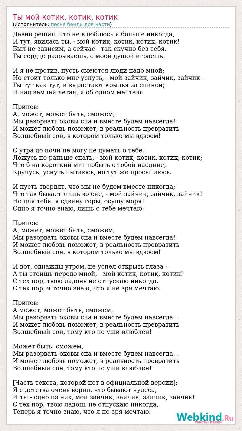 Давно решил, что не влюблюсь я больше никогда, И тут, явилась ты, - мой котик, котик, котик, котик! Был не зависим, а сейчас - так скучно без тебя. Ты сердце разрываешь, с моей душой играешь. И я не против, пусть смеются люди надо мной; Но стоит только мне уснуть, - мой зайчик, зайчик, зайчик - Ты тут как тут, и вырастают крылья за спиной; И над землей летая, я об одном мечтаю: Припев: А, может, может быть, сможем, Мы разорвать оковы сна и вместе будем навсегда! И может любовь поможет, в реальность превратить Волшебный сон, в котором только мы вдвоем! С утра до ночи не могу не думать о тебе. Ложусь по-раньше спать, - мой котик, котик, котик, котик; Что б на короткий миг побыть с тобой наедине, Кручусь, уснуть пытаюсь, но тут же просыпаюсь. И пусть твердят, что мы не будем вместе никогда; Что так бывает лишь во сне, - мой зайчик, зайчик, зайчик! Но для тебя, я сдвину горы, осушу моря! Одно я точно знаю, лишь о тебе мечтаю: Припев: А, может, может быть, сможем, Мы разорвать оковы сна и вместе будем навсегда! И может любовь поможет, в реальность превратить Волшебный сон, в котором только мы вдвоем! И вот, однажды утром, не успел открыть глаза - А ты стоишь передо мной, - мой котик, котик, котик! С тех пор, твою ладонь не отпускаю никогда. С тех пор, я точно знаю, что я не зря мечтаю. Припев: А может, может быть, сможем, Мы разорвать оковы сна и вместе будем навсегда… И может любовь поможет, в реальность превратить Волшебный сон, тому кто по уши влюблен! Может быть, сможем, Мы разорвать оковы сна и вместе будем навсегда… И может любовь поможет, в реальность превратить Волшебный сон, тому кто по уши влюблен! [Часть текста, которой нет в официальной версии]: Я с детства очень верил, что бывают чудеса, И ты - одно из них, мой зайчик, зайчик, зайчик, зайчик! С тех пор, твою ладонь не отпускаю никогда, Теперь я точно знаю, что я не зря мечтаю.
