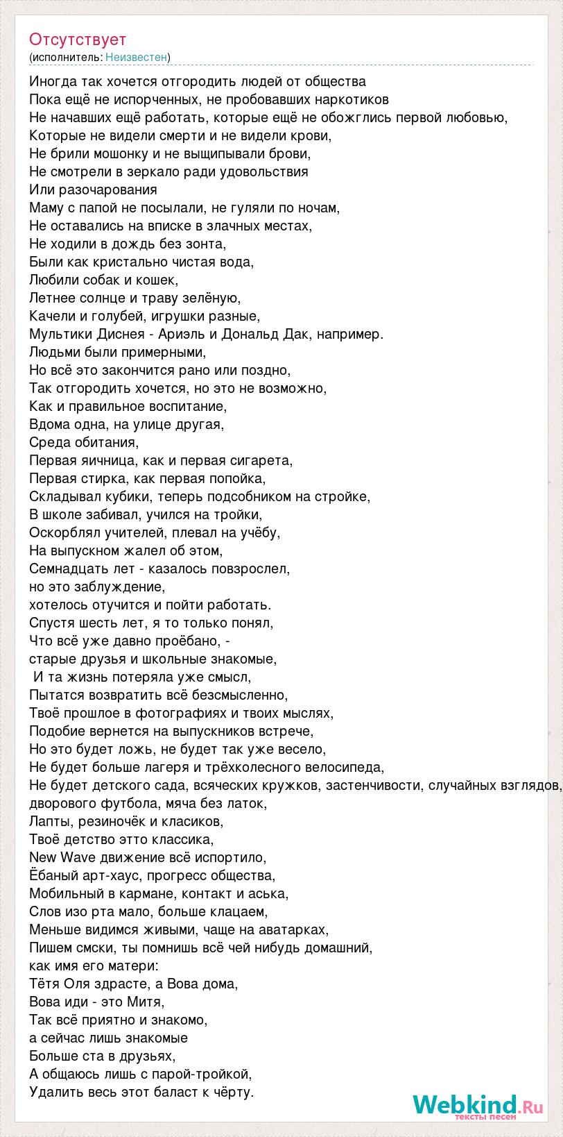 Иногда так хочется отгородить людей от общества Пока ещё не испорченных, не пробовавших наркотиков Не начавших ещё работать, которые ещё не обожглись первой любовью, Которые не видели смерти и не видели крови, Не брили мошонку и не выщипывали брови, Не смотрели в зеркало ради удовольствия Или разочарования Маму с папой не посылали, не гуляли по ночам, Не оставались на вписке в злачных местах, Не ходили в дождь без зонта, Были как кристально чистая вода, Любили собак и кошек, Летнее солнце и траву зелёную, Качели и голубей, игрушки разные, Мультики Диснея - Ариэль и Дональд Дак, например. Людьми были примерными, Но всё это закончится рано или поздно, Так отгородить хочется, но это не возможно, Как и правильное воспитание, Вдома одна, на улице другая, Среда обитания, Первая яичница, как и первая сигарета, Первая стирка, как первая попойка, Складывал кубики, теперь подсобником на стройке, В школе забивал, учился на тройки, Оскорблял учителей, плевал на учёбу, На выпускном жалел об этом, Семнадцать лет - казалось повзрослел, но это заблуждение, хотелось отучится и пойти работать. Спустя шесть лет, я то только понял, Что всё уже давно проёбано, - старые друзья и школьные знакомые, И та жизнь потеряла уже смысл, Пытатся возвратить всё безсмысленно, Твоё прошлое в фотографиях и твоих мыслях, Подобие вернется на выпускников встрече, Но это будет ложь, не будет так уже весело, Не будет больше лагеря и трёхколесного велосипеда, Не будет детского сада, всяческих кружков, застенчивости, случайных взглядов, дворового футбола, мяча без латок, Лапты, резиночёк и класиков, Твоё детство этто классика, New Wave движение всё испортило, Ёбаный арт-хаус, прогресс общества, Мобильный в кармане, контакт и аська, Слов изо рта мало, больше клацаем, Меньше видимся живыми, чаще на аватарках, Пишем смски, ты помнишь всё чей нибудь домашний, как имя его матери: Тётя Оля здрасте, а Вова дома, Вова иди - это Митя, Так всё приятно и знакомо, а сейчас лишь знакомые Больше ста в друзьях, А общаюсь лишь с парой-тройкой, Удалить весь этот баласт к чёрту.