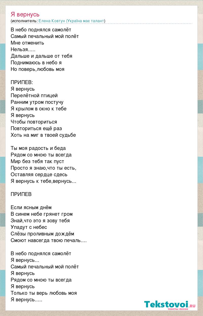 В небо поднялся самолёт Самый печальный мой полёт Мне отменить Нельзя..... Дальше и дальше от тебя Поднимаюсь в небо я Но поверь,любовь моя ПРИПЕВ: Я вернусь Перелётной птицей Ранним утром постучу Я крылом в окно к тебе Я вернусь Чтобы повториться Повториться ещё раз Хоть на миг в твоей судьбе Ты моя радость и беда Рядом со мною ты всегда Мир без тебя так пуст Просто я знаю,что ты есть, Оставляя сердце сдесь Я вернусь к тебе,вернусь... ПРИПЕВ Если ясным днём В синем небе грянет гром Знай,что это я зову тебя Упадут с небес Слёзы проливным дождём Смоют навсегда твою печаль.... В небо поднялся самолёт Я вернусь... Самый печальный мой полёт Я вернусь Рядом со мною ты всегда Я вернусь Только ты верь любовь моя Я вернусь.....