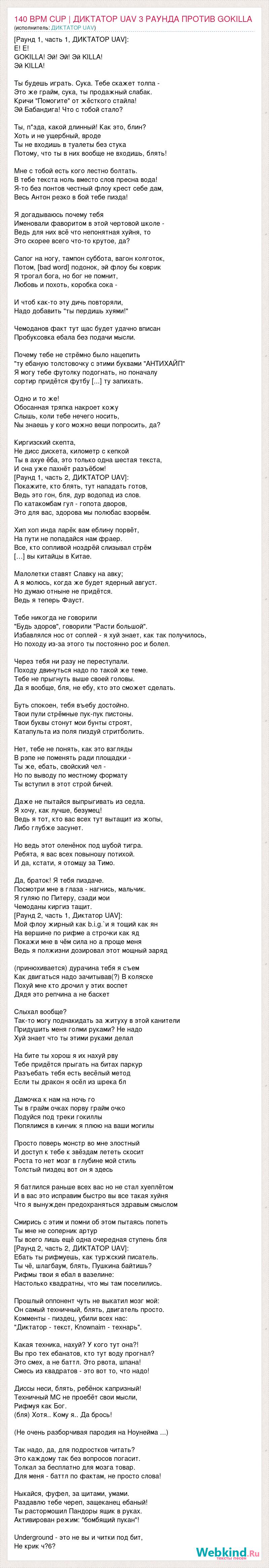 [Раунд 1, часть 1, ДИКТАТОР UAV]: Е! Е! GOKILLA! Эй! Эй! Эй KILLA! Эй KILLA! Ты будешь играть. Сука. Тебе скажет толпа - Это же грайм, сука, ты продажный слабак. Кричи "Помогите" от жёсткого стайла! Эй Бабандига! Что с тобой стало? Ты, п*зда, какой длинный! Как это, блин? Хоть и не ущербный, вроде Ты не входишь в туалеты без стука Потому, что ты в них вообще не входишь, блять! Мне с тобой есть кого лестно болтать. В тебе текста ноль вместо слов пресна вода! Я-то без понтов честный флоу крест себе дам, Весь Антон резко в бой тебе пизда! Я догадываюсь почему тебя Именовали фаворитом в этой чертовой школе - Ведь для них всё что непонятная хуйня, то Это скорее всего что-то крутое, да? Сапог на ногу, тампон суббота, вагон колготок, Потом, [bad word] подонок, эй флоу бы коврик Я трогал бога, но бог не помнит, Любовь и похоть, коробка сока - И чтоб как-то эту дичь повторяли, Надо добавить "ты пердишь хуями!" Чемоданов факт тут щас будет удачно вписан Пробуксовка ебала без подачи мысли. Почему тебе не стрёмно было нацепить "ту ебаную толстовочку с этими буквами "АНТИХАЙП" Я могу тебе футолку подогнать, но поначалу сортир придётся футбу [...] ту запихать. Одно и то же! Обосанная тряпка накроет кожу Слышь, коли тебе нечего носить, Nы знаешь у кого можно вещи попросить, да? Киргизский скепта, Не дисс дискета, километр с кепкой Ты в ахуе ёба, это только одна шестая текста, И она уже пахнёт разъёбом! [Раунд 1, часть 2, ДИКТАТОР UAV]: Покажите, кто блять, тут нападать готов, Ведь это гон, бля, дур водопад из слов. По катакомбам гул - гопота дворов, Это для вас, здорова мы полюбас взорвём. Хип хоп инда ларёк вам еблину порвёт, На пути не попадайся нам фраер. Все, кто сопливой ноздрёй слизывал стрём […] вы китайцы в Китае. Малолетки ставят Славку на авку; А я молюсь, когда же будет ядерный август. Но думаю отныне не придётся. Ведь я теперь Фауст. Тебе никогда не говорили "Будь здоров", говорили "Расти большой". Избавлялся нос от соплей - я хуй знает, как так получилось, Но походу из-за этого ты постоянно рос и болел. Через тебя ни разу не переступали. Походу двинуться надо по такой же теме. Тебе не прыгнуть выше своей головы. Да я вообще, бля, не ебу, кто это сможет сделать. Буть спокоен, тебя въебу достойно. Твои пули стрёмные пук-пук пистоны. Твои буквы стонут мои бунты строят, Катапульта из поля пиздуй стритболить. Нет, тебе не понять, как это взгляды В рэпе не поменять ради площадки - Ты же, ебать, свойский чел - Но по выводу по местному формату Ты вступил в этот строй бичей. Даже не пытайся выпрыгивать из седла. Я хочу, как лучше, безумец! Ведь я тот, кто вас всех тут вытащит из жопы, Либо глубже засунет. Но ведь этот оленёнок под шубой тигра. Ребята, я вас всех повыношу потихой. И да, кстати, я отомщу за Тимо. Да, браток! Я тебя пиздаче. Посмотри мне в глаза - нагнись, мальчик. Я гуляю по Питеру, сзади мои Чемоданы киргиз тащит. [Раунд 2, часть 1, Диктатор UAV]: Мой флоу жирный как b.i.g.`и я тощий как ян На вершине по рифме а строчки как яд Покажи мне в чём сила но а проще меня Ведь я полжизни дозировал этот мощный заряд (принюхивается) дурачина тебя я съем Как двигаться надо зачитывав(?) В коляске Похуй мне кто дрочил у этих воспет Дядя это репчина а не баскет Слыхал вообще? Так-то могу поднакидать за житуху в этой канители Придушить меня голми руками? Не надо Хуй знает что ты этими руками делал На бите ты хорош я их нахуй рву Тебе придётся прыгать на б