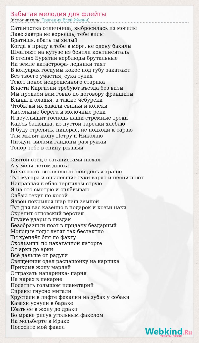 Сатанистка отличница, выбросилась из могилы Лаве завтра не вернёшь, тебе вилы Братишь, ебать ты хилый Когда я приду к тебе в морг, не одену бахилы Шмаляют на кутузе из бентли континенталь В степях Бурятии верблюды брутальные На земле катастрофа- ледники таят В колуарах госдумы кокос под губу закатают Без твоего участия, сука тупая Текёт понос некрещённого старика Власти Киргизии требуют въезда без визы Мы продаём вам говно по договору франшизы Блины и оладья, а также чебуреки Чтобы вы их хавали свиньи и колеки Кисельные берега и молочные реки И доуслышит господь наши стрёмные треки Каюсь батюшка, из пустой тарелки хлебаю Я буду стрелять, пидорас, не подходи к сараю Там мылят жопу Петру и Николаю Пиздуй, вилами гандоны разгружай Топор тебе в спину ржавый Святой отец с сатанистами нюхал А у меня летом днюха Её челюсть вставную по сей день я храню Тут мусара и ошалевшие гуки варят и песни поют Направлая в ебло терпилам струю Я на это смотрю и сплёвываю Слёзы текут по косой Язвой покрылся шар наш земной Тут для вас казенно в подарок и козьи наки Скрепит отцовский верстак Глухие удары в пиздак Безобразный поэт в придачу бездарный Молодые годы летят так бестактно Ты хуеплёт бля по факту Скользишь по накатанной каторге От арки до арки Всё дальше от радуги Священник одел распашонку на карлика Прикрыв жопу марлей Оттрахать напарника- парня На нарах в пекарне Посетить голышом планетарий Сирены гнусно мигали Хрустели в лифте фекалии на зубах у собаки Казахи уснули в бараке Ебать её в жопу до драки Во мраке рисуя угольным факелом На мольберте в Ираке Пососите мой факел