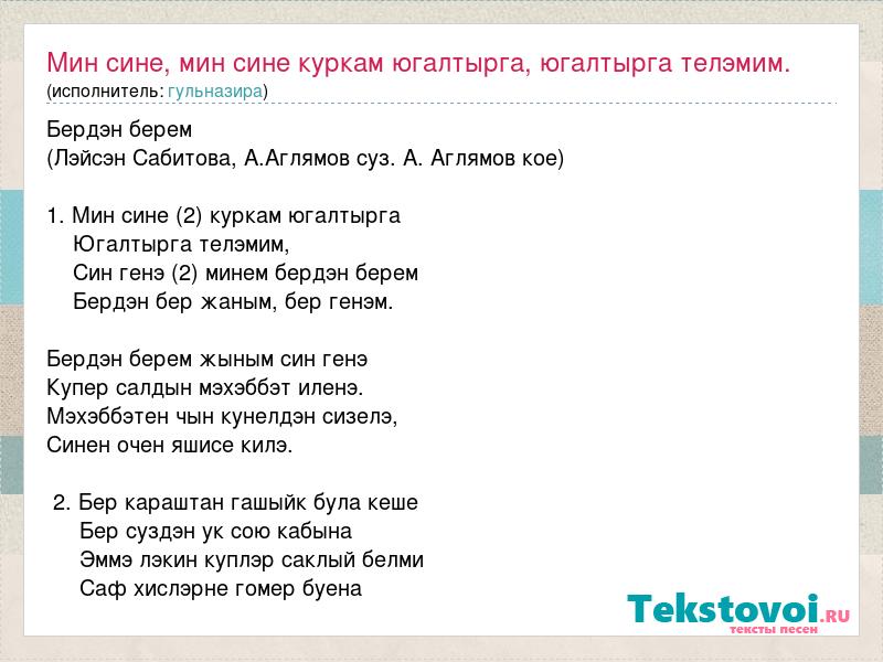 Главная→Исполнители→Гульназира→Мин сине, мин сине куркам югалтырга, югалтырга телэмим. Син генэ, син генэ минем