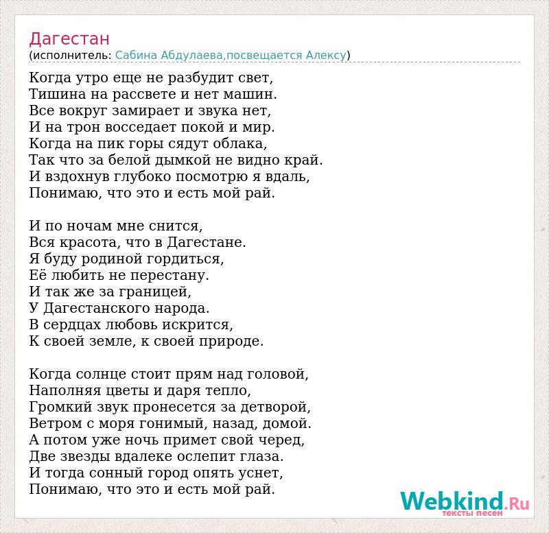 Когда утро еще не разбудит свет, Тишина на рассвете и нет машин. Все вокруг замирает и звука нет, И на трон восседает покой и мир. Когда на пик горы сядут облака, Так что за белой дымкой не видно край. И вздохнув глубоко посмотрю я вдаль, Понимаю, что это и есть мой рай. И по ночам мне снится, Вся красота, что в Дагестане. Я буду родиной гордиться, Её любить не перестану. И так же за границей, У Дагестанского народа. В сердцах любовь искрится, К своей земле, к своей природе. Когда солнце стоит прям над головой, Наполняя цветы и даря тепло, Громкий звук пронесется за детворой, Ветром с моря гонимый, назад, домой. А потом уже ночь примет свой черед, Две звезды вдалеке ослепит глаза. И тогда сонный город опять уснет, Понимаю, что это и есть мой рай.