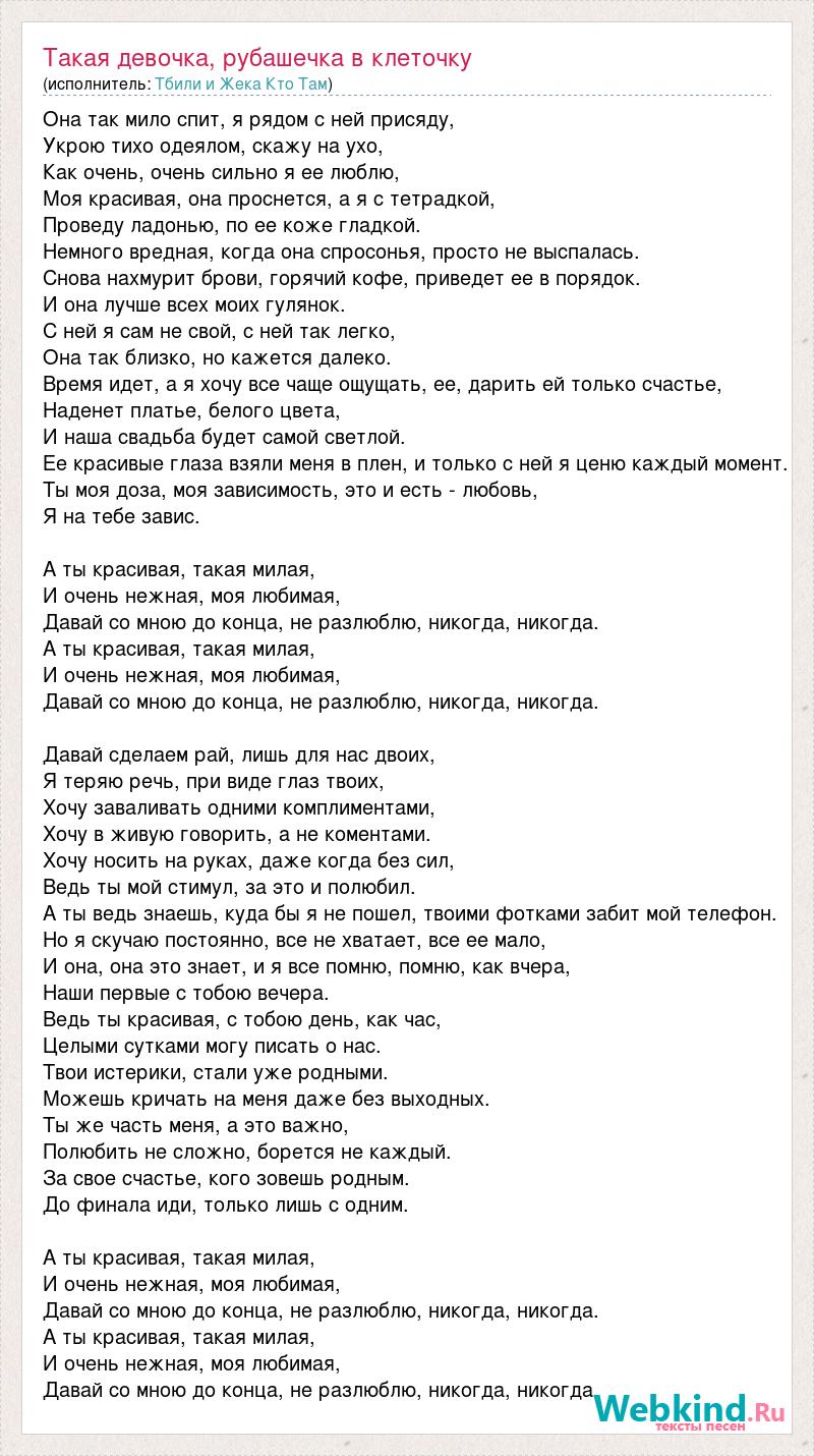 Она так мило спит, я рядом с ней присяду, Укрою тихо одеялом, скажу на ухо, Как очень, очень сильно я ее люблю, Моя красивая, она проснется, а я с тетрадкой, Проведу ладонью, по ее коже гладкой. Немного вредная, когда она спросонья, просто не выспалась. Снова нахмурит брови, горячий кофе, приведет ее в порядок. И она лучше всех моих гулянок. С ней я сам не свой, с ней так легко, Она так близко, но кажется далеко. Время идет, а я хочу все чаще ощущать, ее, дарить ей только счастье, Наденет платье, белого цвета, И наша свадьба будет самой светлой. Ее красивые глаза взяли меня в плен, и только с ней я ценю каждый момент. Ты моя доза, моя зависимость, это и есть - любовь, Я на тебе завис. А ты красивая, такая милая, И очень нежная, моя любимая, Давай со мною до конца, не разлюблю, никогда, никогда. А ты красивая, такая милая, И очень нежная, моя любимая, Давай со мною до конца, не разлюблю, никогда, никогда. Давай сделаем рай, лишь для нас двоих, Я теряю речь, при виде глаз твоих, Хочу заваливать одними комплиментами, Хочу в живую говорить, а не коментами. Хочу носить на руках, даже когда без сил, Ведь ты мой стимул, за это и полюбил. А ты ведь знаешь, куда бы я не пошел, твоими фотками забит мой телефон. Но я скучаю постоянно, все не хватает, все ее мало, И она, она это знает, и я все помню, помню, как вчера, Наши первые с тобою вечера. Ведь ты красивая, с тобою день, как час, Целыми сутками могу писать о нас. Твои истерики, стали уже родными. Можешь кричать на меня даже без выходных. Ты же часть меня, а это важно, Полюбить не сложно, борется не каждый. За свое счастье, кого зовешь родным. До финала иди, только лишь с одним. А ты красивая, такая милая, И очень нежная, моя любимая, Давай со мною до конца, не разлюблю, никогда, никогда. А ты красивая, такая милая, И очень нежная, моя любимая, Давай со мною до конца, не разлюблю, никогда, никогда.