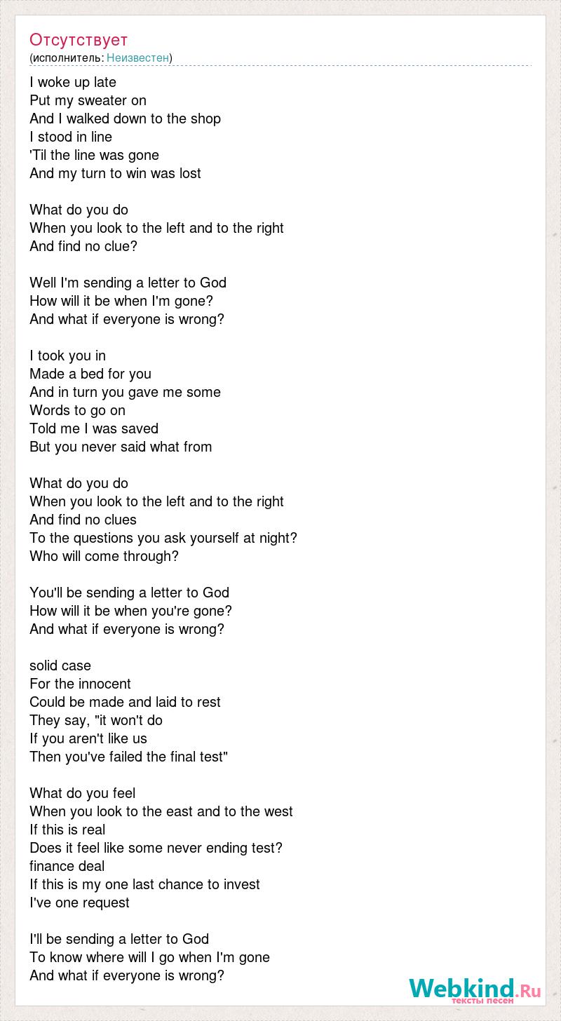I woke up late Put my sweater on And I walked down to the shop I stood in line 'Til the line was gone And my turn to win was lost What do you do When you look to the left and to the right And find no clue? Well I'm sending a letter to God How will it be when I'm gone? And what if everyone is wrong? I took you in Made a bed for you And in turn you gave me some Words to go on Told me I was saved But you never said what from What do you do When you look to the left and to the right And find no clues To the questions you ask yourself at night? Who will come through? You'll be sending a letter to God How will it be when you're gone? And what if everyone is wrong? solid case For the innocent Could be made and laid to rest They say, "it won't do If you aren't like us Then you've failed the final test" What do you feel When you look to the east and to the west If this is real Does it feel like some never ending test? finance deal If this is my one last chance to invest I've one request I'll be sending a letter to God To know where will I go when I'm gone And what if everyone is wrong?