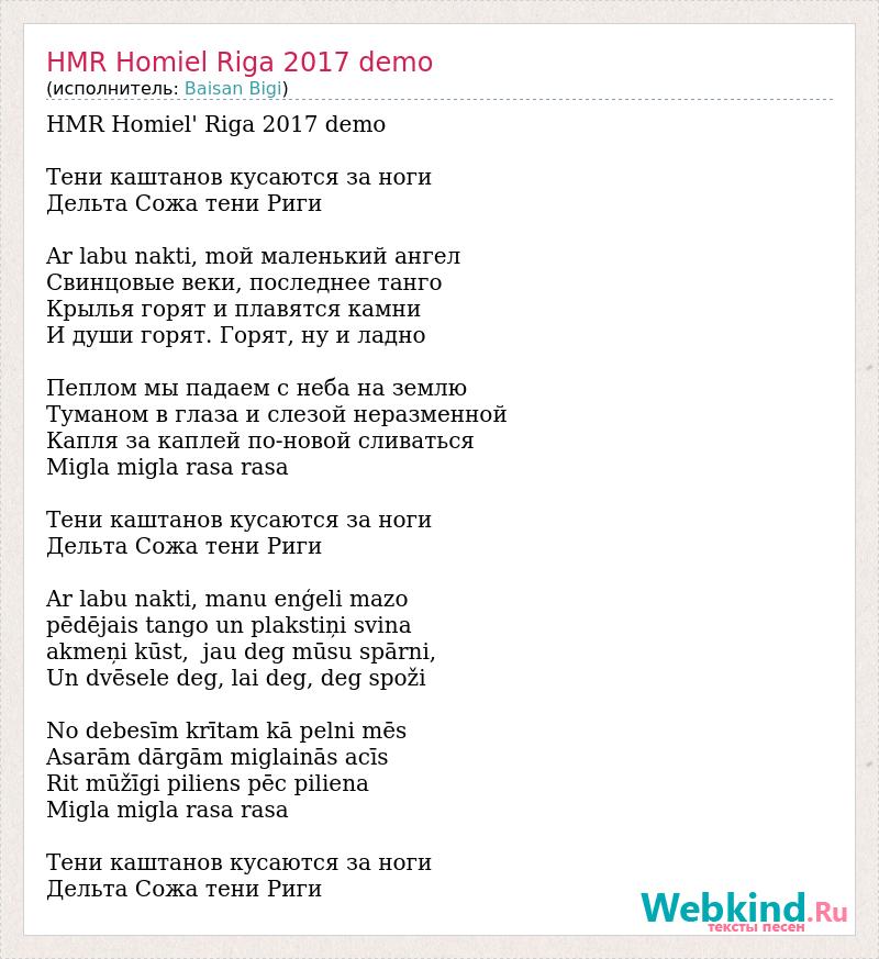 HMR Homiel' Riga 2017 demo Тени каштанов кусаются за ноги Дельта Сожа тени Риги Ar labu nakti, mой маленький ангел Свинцовые веки, последнее танго Крылья горят и плавятся камни И души горят. Горят, ну и ладно Пеплом мы падаем с неба на землю Туманом в глаза и слезой неразменной Капля за каплей по-новой сливаться Migla migla rasa rasa Тени каштанов кусаются за ноги Дельта Сожа тени Риги Ar labu nakti, manu enģeli mazo pēdējais tango un plakstiņi svina akmeņi kūst, jau deg mūsu spārni, Un dvēsele deg, lai deg, deg spoži No debesīm krītam kā pelni mēs Asarām dārgām miglainās acīs Rit mūžīgi piliens pēc piliena Migla migla rasa rasa Тени каштанов кусаются за ноги Дельта Сожа тени Риги