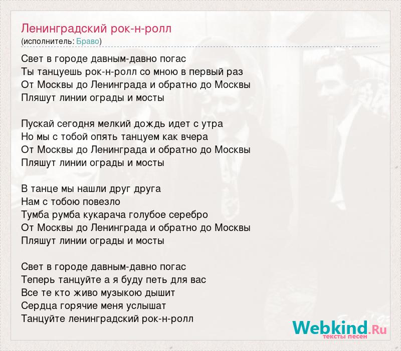 Свет в городе давным-давно погас Ты танцуешь рок-н-ролл со мною в первый раз От Москвы до Ленинграда и обратно до Москвы Пляшут линии ограды и мосты Пускай сегодня мелкий дождь идет с утра Но мы с тобой опять танцуем как вчера От Москвы до Ленинграда и обратно до Москвы Пляшут линии ограды и мосты В танце мы нашли друг друга Нам с тобою повезло Тумба румба кукарача голубое серебро От Москвы до Ленинграда и обратно до Москвы Пляшут линии ограды и мосты Свет в городе давным-давно погас Теперь танцуйте а я буду петь для вас Все те кто живо музыкою дышит Сердца горячие меня услышат Танцуйте ленинградский рок-н-ролл