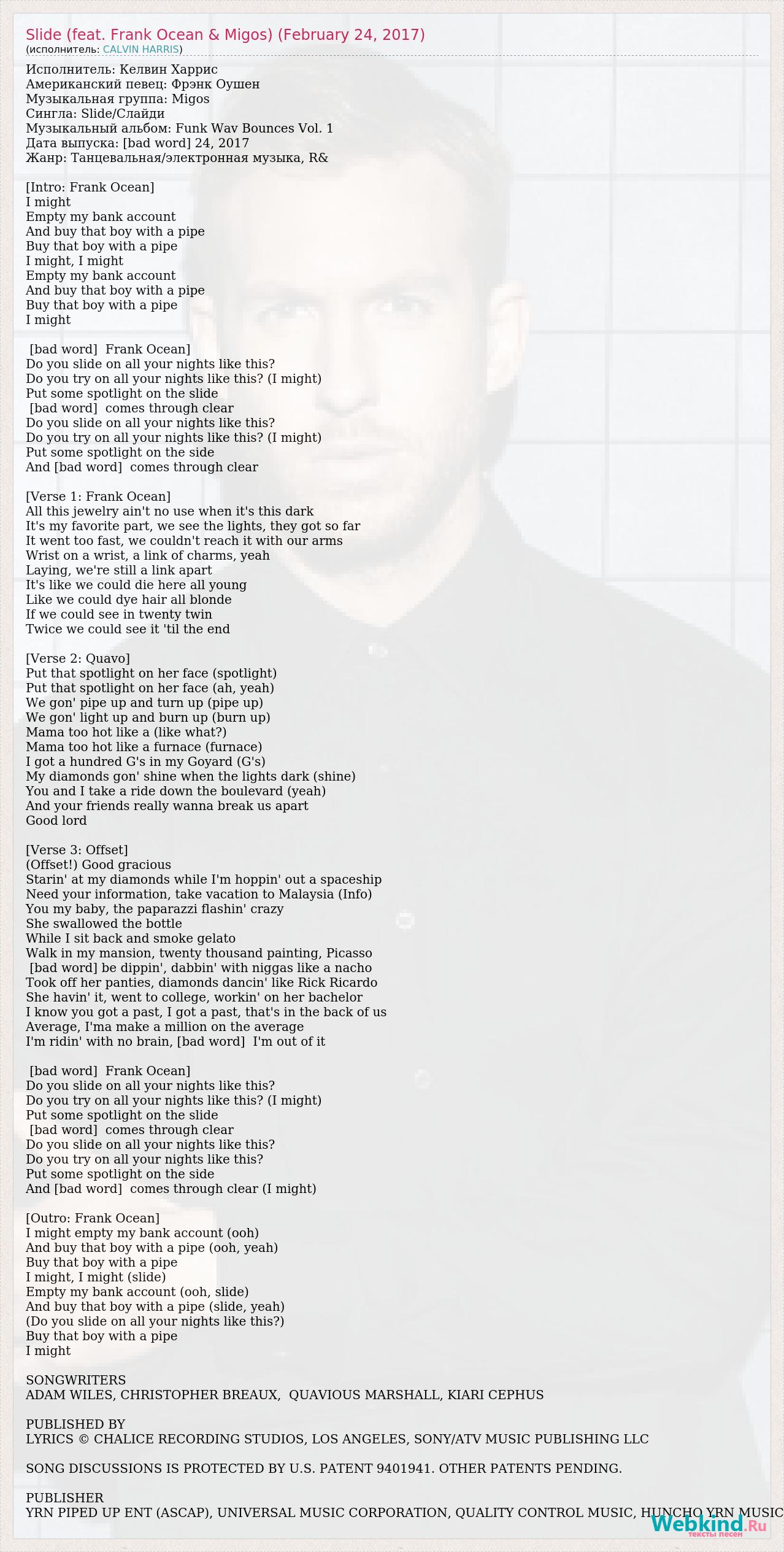 Исполнитель: Келвин Харрис Американский певец: Фрэнк Оушен Музыкальная группа: Migos Сингла: Slide/Слайди Музыкальный альбом: Funk Wav Bounces Vol. 1 Дата выпуска: [bad word] 24, 2017 Жанр: Танцевальная/электронная музыка, R& [Intro: Frank Ocean] I might Empty my bank account And buy that boy with a pipe Buy that boy with a pipe I might, I might Empty my bank account And buy that boy with a pipe Buy that boy with a pipe I might [bad word] Frank Ocean] Do you slide on all your nights like this? Do you try on all your nights like this? (I might) Put some spotlight on the slide [bad word] comes through clear Do you slide on all your nights like this? Do you try on all your nights like this? (I might) Put some spotlight on the side And [bad word] comes through clear [Verse 1: Frank Ocean] All this jewelry ain't no use when it's this dark It's my favorite part, we see the lights, they got so far It went too fast, we couldn't reach it with our arms Wrist on a wrist, a link of charms, yeah Laying, we're still a link apart It's like we could die here all young Like we could dye hair all blonde If we could see in twenty twin Twice we could see it 'til the end [Verse 2: Quavo] Put that spotlight on her face (spotlight) Put that spotlight on her face (ah, yeah) We gon' pipe up and turn up (pipe up) We gon' light up and burn up (burn up) Mama too hot like a (like what?) Mama too hot like a furnace (furnace) I got a hundred G's in my Goyard (G's) My diamonds gon' shine when the lights dark (shine) You and I take a ride down the boulevard (yeah) And your friends really wanna break us apart Good lord [Verse 3: Offset] (Offset!) Good gracious Starin' at my diamonds while I'm hoppin' out a spaceship Need your information, take vacation to Malaysia (Info) You my baby, the paparazzi flashin' crazy She swallowed the bottle While I sit back and smoke gelato Walk in my mansion, twenty thousand painting, Picasso [bad word] be dippin', dabbin' with niggas like a nacho Took off her panties, diamonds dancin' like Rick Ricardo She havin' it, went to college, workin' on her bachelor I know you got a past, I got a past, that's in the back of us Average, I'ma make a million on the average I'm ridin' with no brain, [bad word] I'm out of it [bad word] Frank Ocean] Do you slide on all your nights like this? Do you try on all your nights like this? (I might) Put some spotlight on the slide [bad word] comes through clear Do you slide on all your nights like this? Do you try on all your nights like this? Put some spotlight on the side And [bad word] comes through clear (I might) [Outro: Frank Ocean] I might empty my bank account (ooh) And buy that boy with a pipe (ooh, yeah) Buy that boy with a pipe I might, I might (slide) Empty my bank account (ooh, slide) And buy that boy with a pipe (slide, yeah) (Do you slide on all your nights like this?) Buy that boy with a pipe I might SONGWRITERS ADAM WILES, CHRISTOPHER BREAUX, QUAVIOUS MARSHALL, KIARI CEPHUS PUBLISHED BY LYRICS © CHALICE RECORDING STUDIOS, LOS ANGELES, SONY/ATV MUSIC PUBLISHING LLC SONG DISCUSSIONS IS PROTECTED BY U.S. PATENT 9401941. OTHER PATENTS PENDING. PUBLISHER YRN PIPED UP ENT (ASCAP), UNIVERSAL MUSIC CORPORATION, QUALITY CONTROL MUSIC, HUNCHO YRN MUSIC