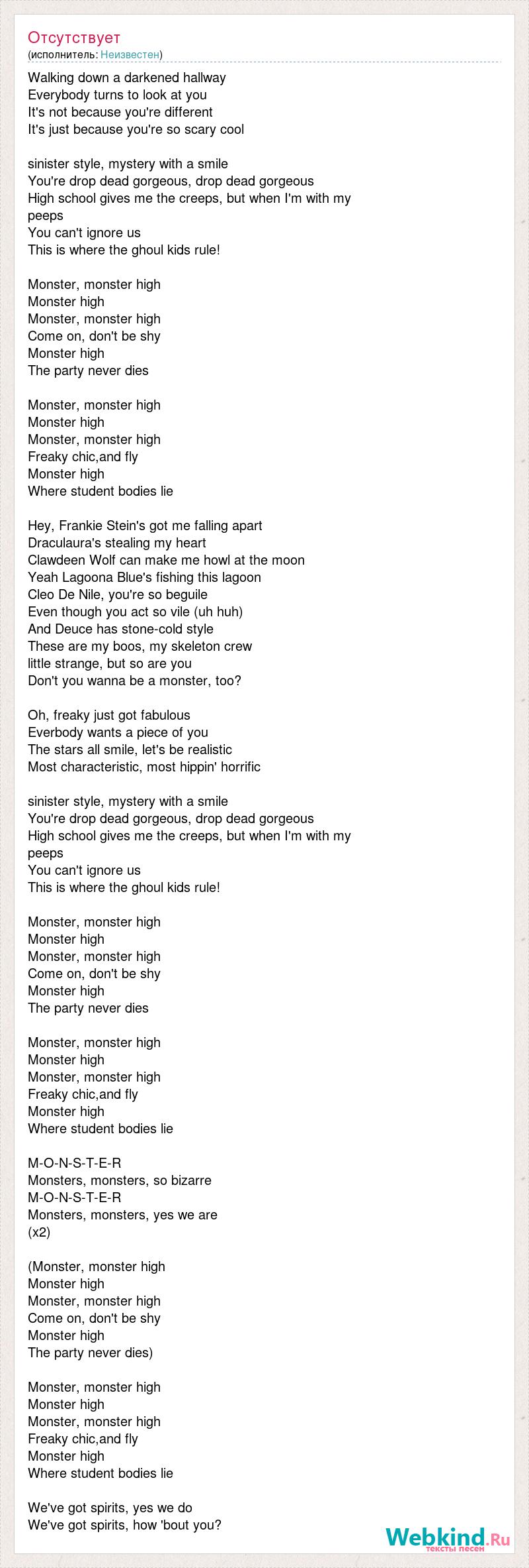Walking down a darkened hallway Everybody turns to look at you It's not because you're different It's just because you're so scary cool sinister style, mystery with a smile You're drop dead gorgeous, drop dead gorgeous High school gives me the creeps, but when I'm with my peeps You can't ignore us This is where the ghoul kids rule! Monster, monster high Monster high Monster, monster high Come on, don't be shy Monster high The party never dies Monster, monster high Monster high Monster, monster high Freaky chic,and fly Monster high Where student bodies lie Hey, Frankie Stein's got me falling apart Draculaura's stealing my heart Clawdeen Wolf can make me howl at the moon Yeah Lagoona Blue's fishing this lagoon Cleo De Nile, you're so beguile Even though you act so vile (uh huh) And Deuce has stone-cold style These are my boos, my skeleton crew little strange, but so are you Don't you wanna be a monster, too? Oh, freaky just got fabulous Everbody wants a piece of you The stars all smile, let's be realistic Most characteristic, most hippin' horrific sinister style, mystery with a smile You're drop dead gorgeous, drop dead gorgeous High school gives me the creeps, but when I'm with my peeps You can't ignore us This is where the ghoul kids rule! Monster, monster high Monster high Monster, monster high Come on, don't be shy Monster high The party never dies Monster, monster high Monster high Monster, monster high Freaky chic,and fly Monster high Where student bodies lie M-O-N-S-T-E-R Monsters, monsters, so bizarre M-O-N-S-T-E-R Monsters, monsters, yes we are (x2) (Monster, monster high Monster high Monster, monster high Come on, don't be shy Monster high The party never dies) Monster, monster high Monster high Monster, monster high Freaky chic,and fly Monster high Where student bodies lie We've got spirits, yes we do We've got spirits, how 'bout you?