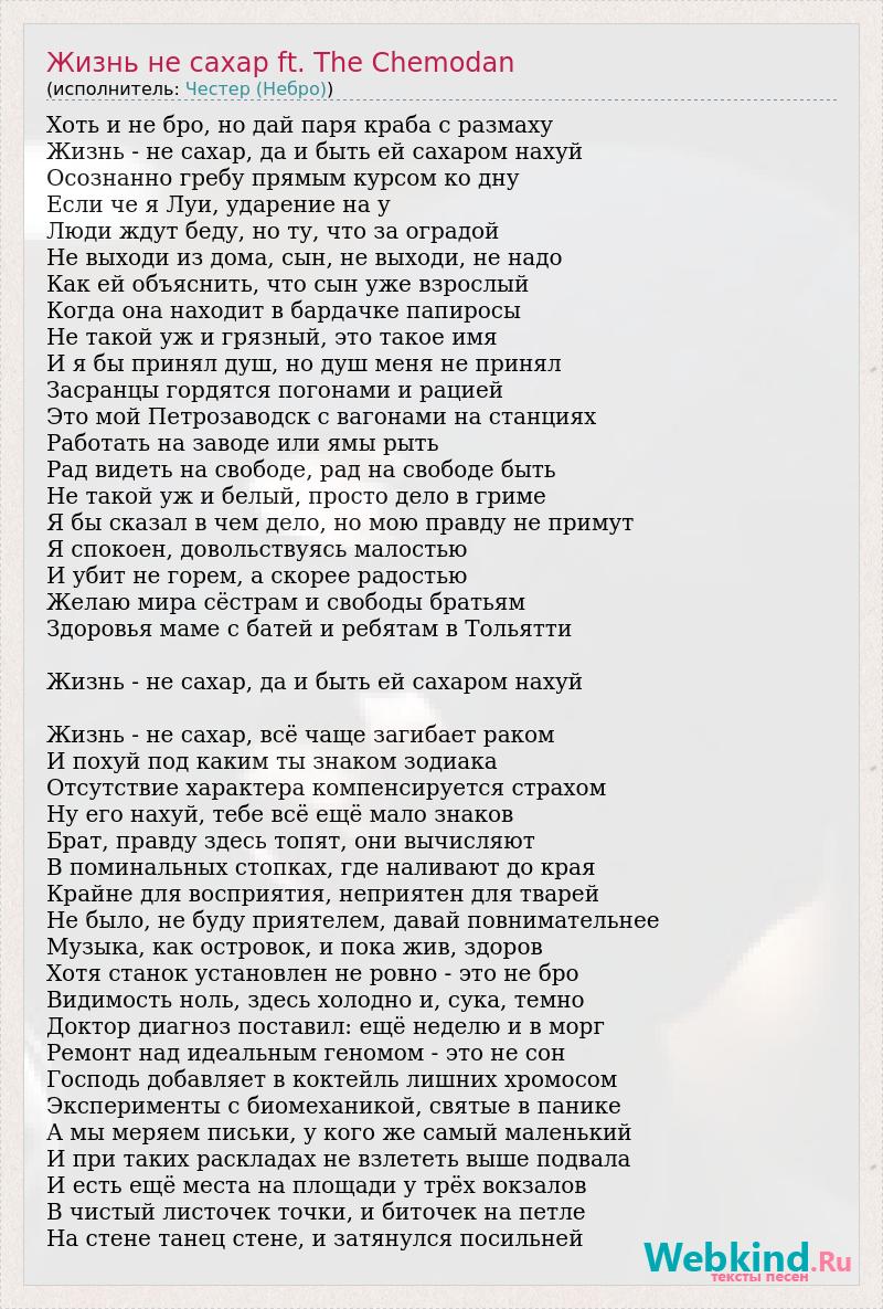 Хоть и не бро, но дай паря краба с размаху Жизнь - не сахар, да и быть ей сахаром нахуй Осознанно гребу прямым курсом ко дну Если че я Луи, ударение на у Люди ждут беду, но ту, что за оградой Не выходи из дома, сын, не выходи, не надо Как ей объяснить, что сын уже взрослый Когда она находит в бардачке папиросы Не такой уж и грязный, это такое имя И я бы принял душ, но душ меня не принял Засранцы гордятся погонами и рацией Это мой Петрозаводск с вагонами на станциях Работать на заводе или ямы рыть Рад видеть на свободе, рад на свободе быть Не такой уж и белый, просто дело в гриме Я бы сказал в чем дело, но мою правду не примут Я спокоен, довольствуясь малостью И убит не горем, а скорее радостью Желаю мира сёстрам и свободы братьям Здоровья маме с батей и ребятам в Тольятти Жизнь - не сахар, да и быть ей сахаром нахуй Жизнь - не сахар, всё чаще загибает раком И похуй под каким ты знаком зодиака Отсутствие характера компенсируется страхом Ну его нахуй, тебе всё ещё мало знаков Брат, правду здесь топят, они вычисляют В поминальных стопках, где наливают до края Крайне для восприятия, неприятен для тварей Не было, не буду приятелем, давай повнимательнее Музыка, как островок, и пока жив, здоров Хотя станок установлен не ровно - это не бро Видимость ноль, здесь холодно и, сука, темно Доктор диагноз поставил: ещё неделю и в морг Ремонт над идеальным геномом - это не сон Господь добавляет в коктейль лишних хромосом Эксперименты с биомеханикой, святые в панике А мы меряем письки, у кого же самый маленький И при таких раскладах не взлететь выше подвала И есть ещё места на площади у трёх вокзалов В чистый листочек точки, и биточек на петле На стене танец стене, и затянулся посильней