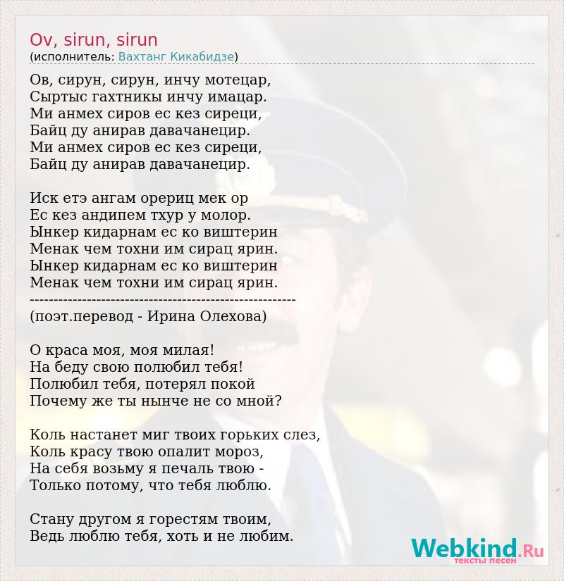 Ов, сирун, сирун, инчу мотецар, Сыртыс гахтникы инчу имацар. Ми анмех сиров ес кез сиреци, Байц ду анирав давачанецир. Ми анмех сиров ес кез сиреци, Байц ду анирав давачанецир. Иск етэ ангам орериц мек ор Ес кез андипем тхур у молор. Ынкер кидарнам ес ко виштерин Менак чем тохни им сирац ярин. Ынкер кидарнам ес ко виштерин Менак чем тохни им сирац ярин. -------------------------------------------------------- (поэт.перевод - Ирина Олехова) О краса моя, моя милая! На беду свою полюбил тебя! Полюбил тебя, потерял покой Почему же ты нынче не со мной? Коль настанет миг твоих горьких слез, Коль красу твою опалит мороз, На себя возьму я печаль твою - Только потому, что тебя люблю. Стану другом я горестям твоим, Ведь люблю тебя, хоть и не любим.
