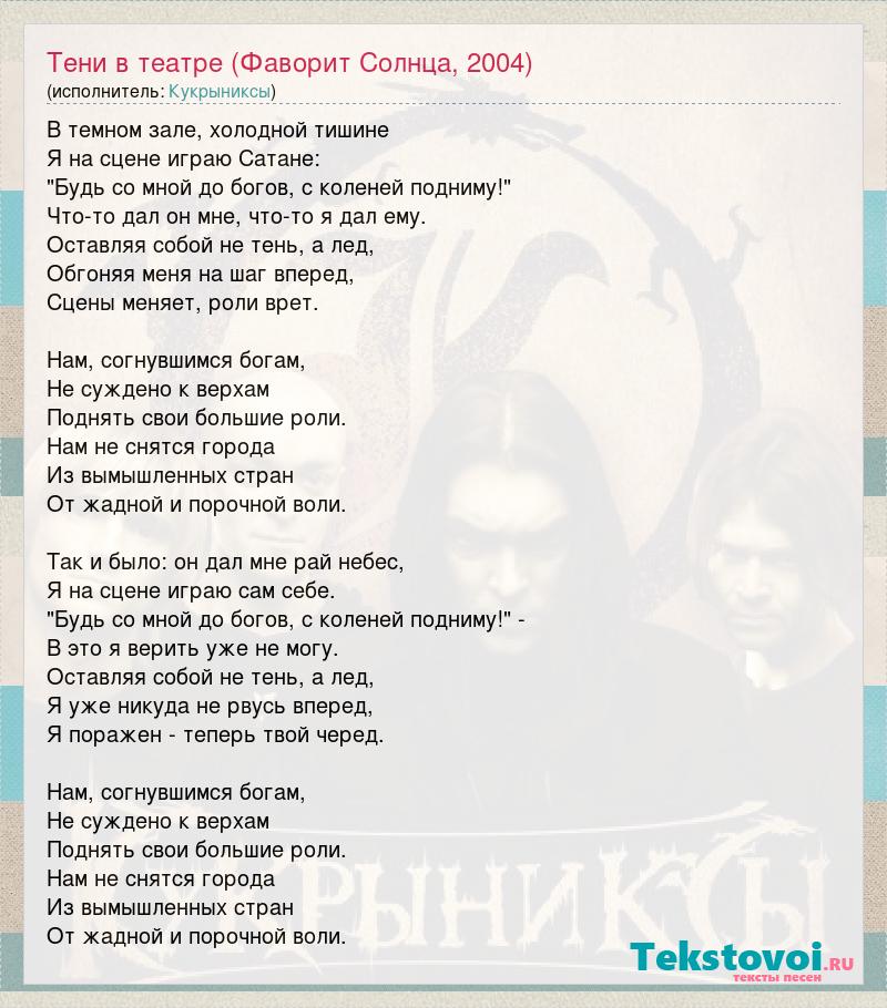 В темном зале, холодной тишине Я на сцене играю Сатане: "Будь со мной до богов, с коленей подниму!" Что-то дал он мне, что-то я дал ему. Оставляя собой не тень, а лед, Обгоняя меня на шаг вперед, Сцены меняет, роли врет. Нам, согнувшимся богам, Не суждено к верхам Поднять свои большие роли. Нам не снятся города Из вымышленных стран От жадной и порочной воли. Так и было: он дал мне рай небес, Я на сцене играю сам себе. "Будь со мной до богов, с коленей подниму!" - В это я верить уже не могу. Оставляя собой не тень, а лед, Я уже никуда не рвусь вперед, Я поражен - теперь твой черед. Нам, согнувшимся богам, Не суждено к верхам Поднять свои большие роли. Нам не снятся города Из вымышленных стран От жадной и порочной воли.