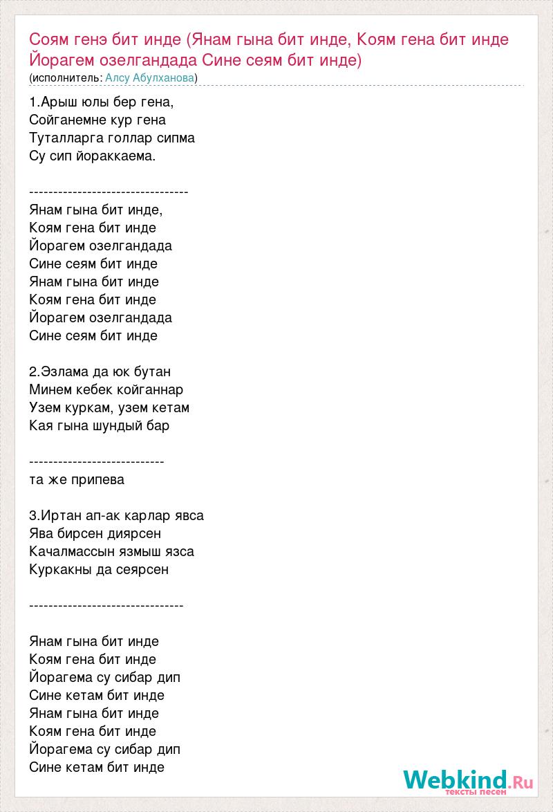 1.Арыш юлы бер гена, Сойганемне кур гена Туталларга голлар сипма Су сип йораккаема. --------------------------------- Янам гына бит инде, Коям гена бит инде Йорагем озелгандада Сине сеям бит инде Янам гына бит инде Коям гена бит инде Йорагем озелгандада Сине сеям бит инде 2.Эзлама да юк бутан Минем кебек койганнар Узем куркам, узем кетам Кая гына шундый бар ---------------------------- та же припева 3.Иртан ап-ак карлар явса Ява бирсен диярсен Качалмассын язмыш язса Куркакны да сеярсен -------------------------------- Янам гына бит инде Коям гена бит инде Йорагема су сибар дип Сине кетам бит инде Янам гына бит инде Коям гена бит инде Йорагема су сибар дип Сине кетам бит инде