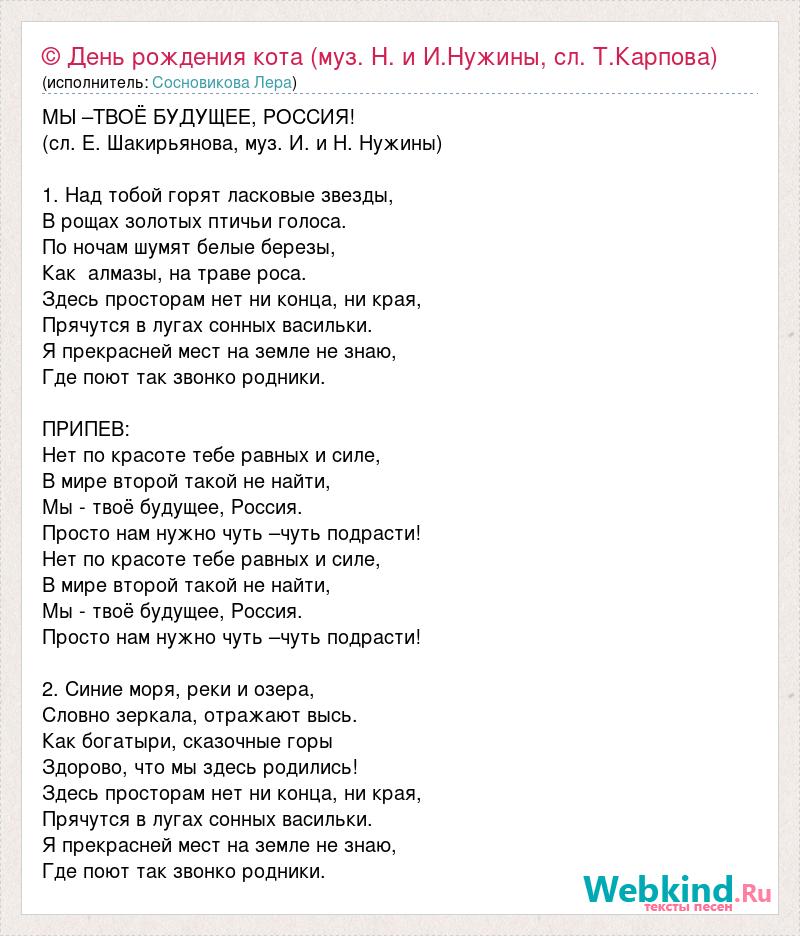 МЫ –ТВОЁ БУДУЩЕЕ, РОССИЯ! (сл. Е. Шакирьянова, муз. И. и Н. Нужины) 1. Над тобой горят ласковые звезды, В рощах золотых птичьи голоса. По ночам шумят белые березы, Как алмазы, на траве роса. Здесь просторам нет ни конца, ни края, Прячутся в лугах сонных васильки. Я прекрасней мест на земле не знаю, Где поют так звонко родники. ПРИПЕВ: Нет по красоте тебе равных и силе, В мире второй такой не найти, Мы - твоё будущее, Россия. Просто нам нужно чуть –чуть подрасти! Нет по красоте тебе равных и силе, В мире второй такой не найти, Мы - твоё будущее, Россия. Просто нам нужно чуть –чуть подрасти! 2. Синие моря, реки и озера, Словно зеркала, отражают высь. Как богатыри, сказочные горы Здорово, что мы здесь родились! Здесь просторам нет ни конца, ни края, Прячутся в лугах сонных васильки. Я прекрасней мест на земле не знаю, Где поют так звонко родники.
