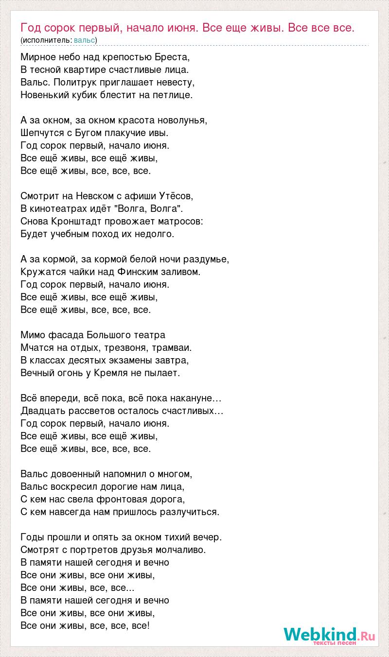 Мирное небо над крепостью Бреста, В тесной квартире счастливые лица. Вальс. Политрук приглашает невесту, Новенький кубик блестит на петлице. А за окном, за окном красота новолунья, Шепчутся с Бугом плакучие ивы. Год сорок первый, начало июня. Все ещё живы, все ещё живы, Все ещё живы, все, все, все. Смотрит на Невском с афиши Утёсов, В кинотеатрах идёт "Волга, Волга". Снова Кронштадт провожает матросов: Будет учебным поход их недолго. А за кормой, за кормой белой ночи раздумье, Кружатся чайки над Финским заливом. Год сорок первый, начало июня. Все ещё живы, все ещё живы, Все ещё живы, все, все, все. Мимо фасада Большого театра Мчатся на отдых, трезвоня, трамваи. В классах десятых экзамены завтра, Вечный огонь у Кремля не пылает. Всё впереди, всё пока, всё пока накануне… Двадцать рассветов осталось счастливых… Год сорок первый, начало июня. Все ещё живы, все ещё живы, Все ещё живы, все, все, все. Вальс довоенный напомнил о многом, Вальс воскресил дорогие нам лица, С кем нас свела фронтовая дорога, С кем навсегда нам пришлось разлучиться. Годы прошли и опять за окном тихий вечер. Смотрят с портретов друзья молчаливо. В памяти нашей сегодня и вечно Все они живы, все они живы, Все они живы, все, все... В памяти нашей сегодня и вечно Все они живы, все они живы, Все они живы, все, все, все!