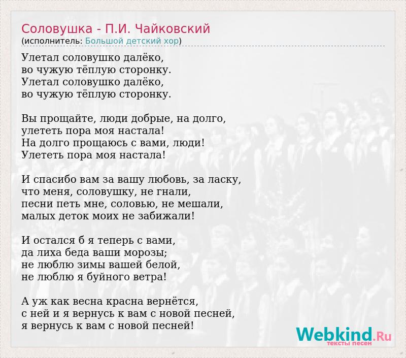 Улетал соловушко далёко, во чужую тёплую сторонку. Улетал соловушко далёко, во чужую тёплую сторонку. Вы прощайте, люди добрые, на долго, улететь пора моя настала! На долго прощаюсь с вами, люди! Улететь пора моя настала! И спасибо вам за вашу любовь, за ласку, что меня, соловушку, не гнали, песни петь мне, соловью, не мешали, малых деток моих не забижали! И остался б я теперь с вами, да лиха беда ваши морозы; не люблю зимы вашей белой, не люблю я буйного ветра! А уж как весна красна вернётся, с ней и я вернусь к вам с новой песней, я вернусь к вам с новой песней!