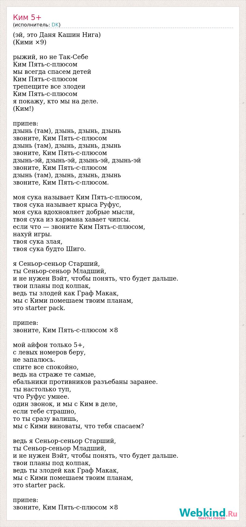(эй, это Даня Кашин Нига) (Кими ×9) рыжий, но не Так-Себе Ким Пять-с-плюсом мы всегда спасем детей Ким Пять-с-плюсом трепещите все злодеи Ким Пять-с-плюсом я покажу, кто мы на деле. (Ким!) припев: дзынь (там), дзынь, дзынь, дзынь звоните, Ким Пять-с-плюсом дзынь (там), дзынь, дзынь, дзынь звоните, Ким Пять-с-плюсом дзынь-эй, дзынь-эй, дзынь-эй, дзынь-эй звоните, Ким Пять-с-плюсом дзынь (там), дзынь, дзынь, дзынь звоните, Ким Пять-с-плюсом. моя сука называет Ким Пять-с-плюсом, твоя сука называет крыса Руфус, моя сука вдохновляет добрые мысли, твоя сука из кармана хавает чипсы. если что — звоните Ким Пять-с-плюсом, нахуй игры. твоя сука злая, твоя сука будто Шиго. я Сеньор-сеньор Старший, ты Сеньор-сеньор Младший, и не нужен Вэйт, чтобы понять, что будет дальше. твои планы под колпак, ведь ты злодей как Граф Макак, мы с Кими помешаем твоим планам, это starter pack. припев: звоните, Ким Пять-с-плюсом ×8 мой айфон только 5+, с левых номеров беру, не запалюсь. спите все спокойно, ведь на страже те самые, ебальники противников разъебаны заранее. ты настолько туп, что Руфус умнее. один звонок, и мы с Ким в деле, если тебе страшно, то ты сразу валишь, мы с Кими виноваты, что тебя спасаем? ведь я Сеньор-сеньор Старший, ты Сеньор-сеньор Младший, и не нужен Вэйт, чтобы понять, что будет дальше. твои планы под колпак, ведь ты злодей как Граф Макак, мы с Кими помешаем твоим планам, это starter pack. припев: звоните, Ким Пять-с-плюсом ×8