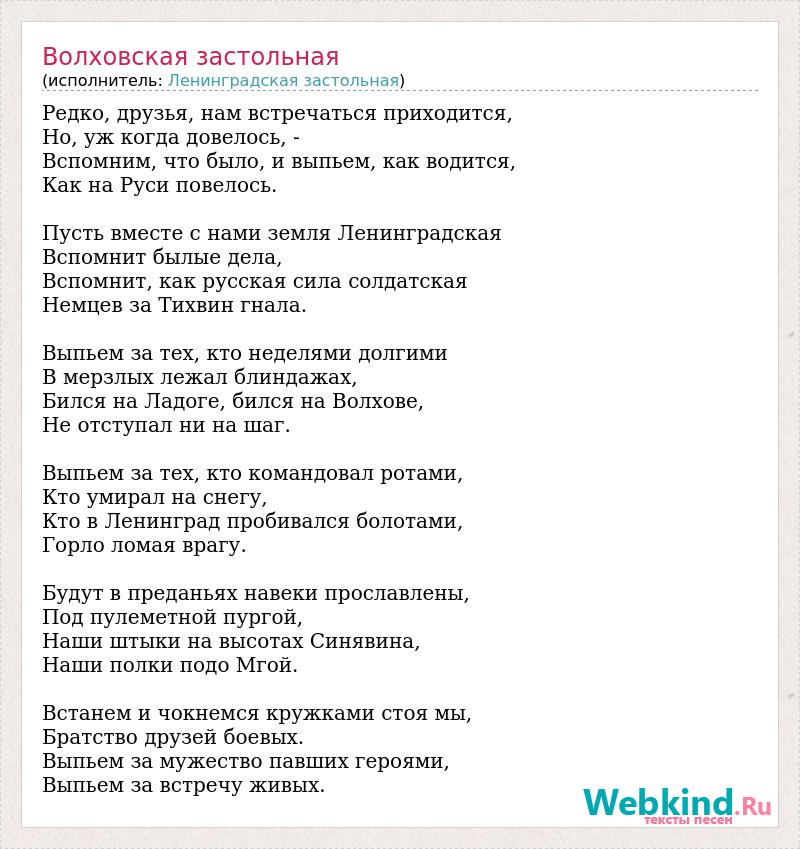 Редко, друзья, нам встречаться приходится, Но, уж когда довелось, - Вспомним, что было, и выпьем, как водится, Как на Руси повелось. Пусть вместе с нами земля Ленинградская Вспомнит былые дела, Вспомнит, как русская сила солдатская Немцев за Тихвин гнала. Выпьем за тех, кто неделями долгими В мерзлых лежал блиндажах, Бился на Ладоге, бился на Волхове, Не отступал ни на шаг. Выпьем за тех, кто командовал ротами, Кто умирал на снегу, Кто в Ленинград пробивался болотами, Горло ломая врагу. Будут в преданьях навеки прославлены, Под пулеметной пургой, Наши штыки на высотах Синявина, Наши полки подо Мгой. Встанем и чокнемся кружками стоя мы, Братство друзей боевых. Выпьем за мужество павших героями, Выпьем за встречу живых.